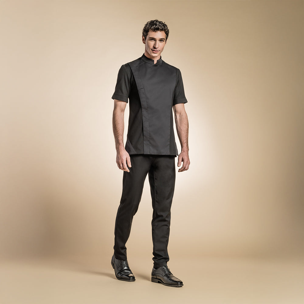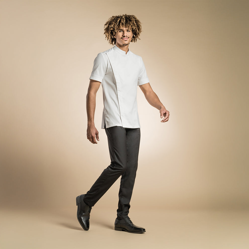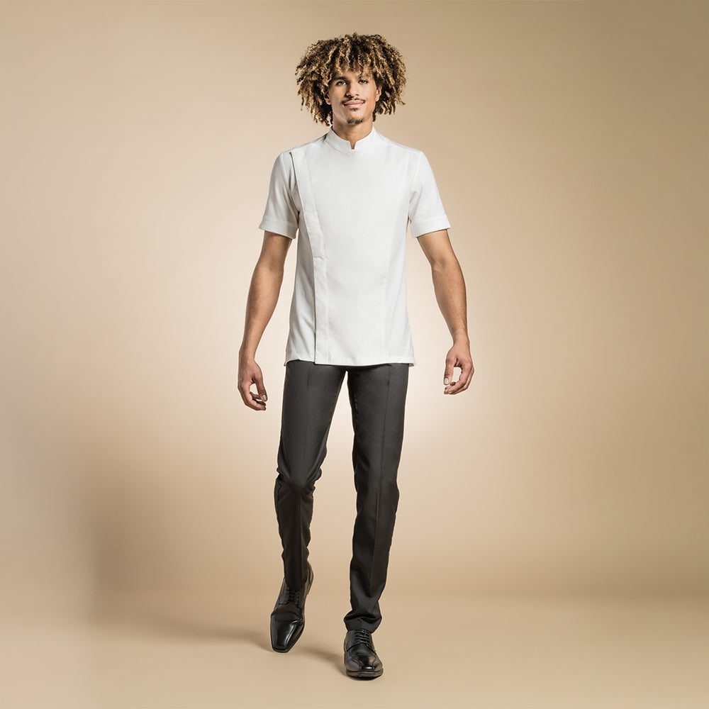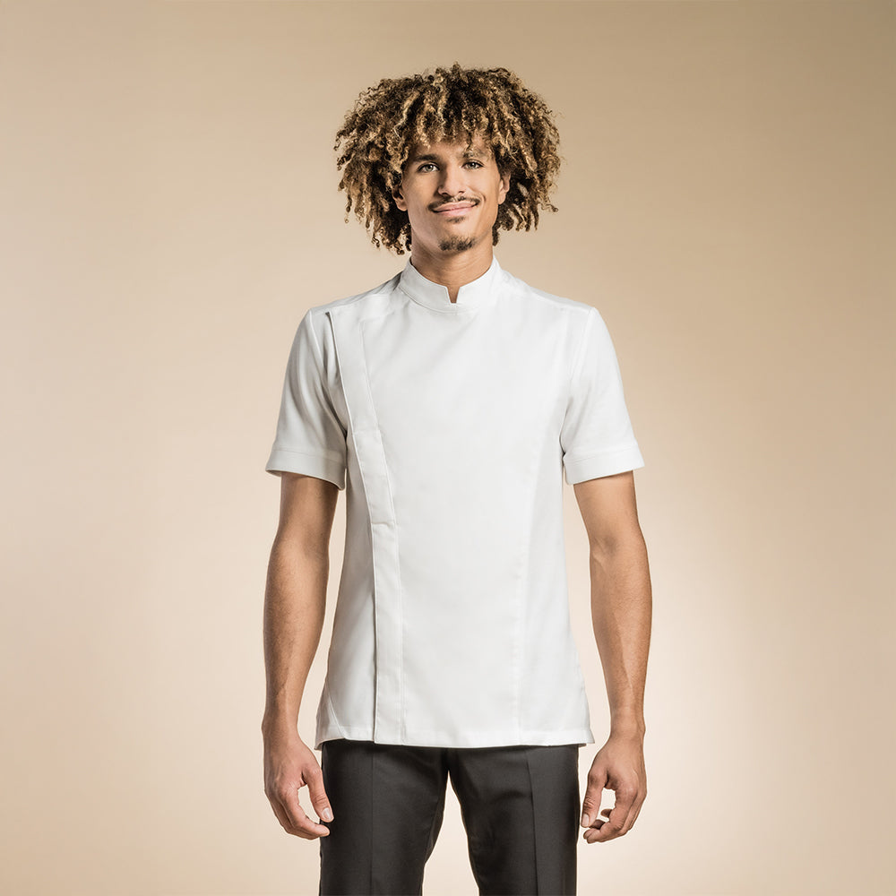 HYBRID Men's Short Sleeve Chef Jacket: Features a combination of polyester-cotton warp and weft weave coupled with the comfort of our non-deformable technical jersey fabric utilizing our hybrid technology. This means you are getting a unique garment created specifically for chefs maximizing comfort and durability. This Chef Jacket features a collar band with a front opening, hidden snap buttons, a pen pocket alongside the yoke, and side slits for breathability.