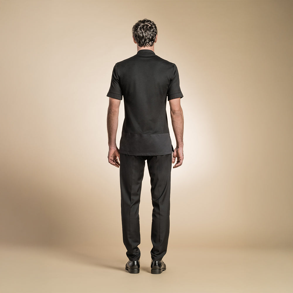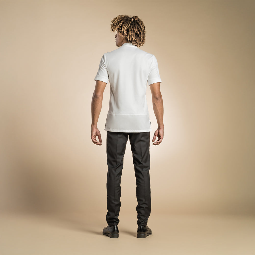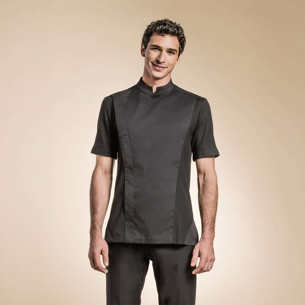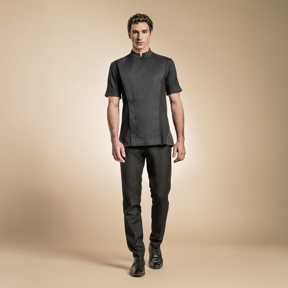 HYBRID Men's Short Sleeve Chef Jacket: Features a combination of polyester-cotton warp and weft weave coupled with the comfort of our non-deformable technical jersey fabric utilizing our hybrid technology. This means you are getting a unique garment created specifically for chefs maximizing comfort and durability. This Chef Jacket features a collar band with a front opening, hidden snap buttons, a pen pocket alongside the yoke, and side slits for breathability.