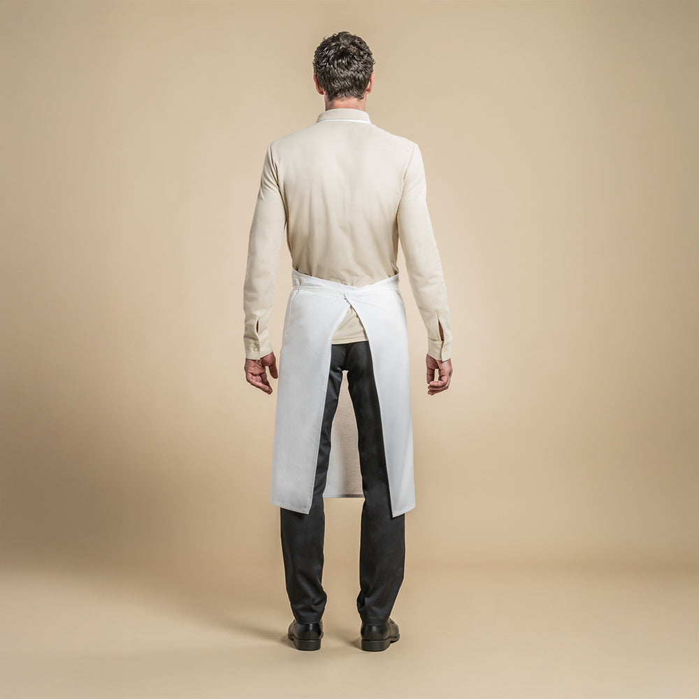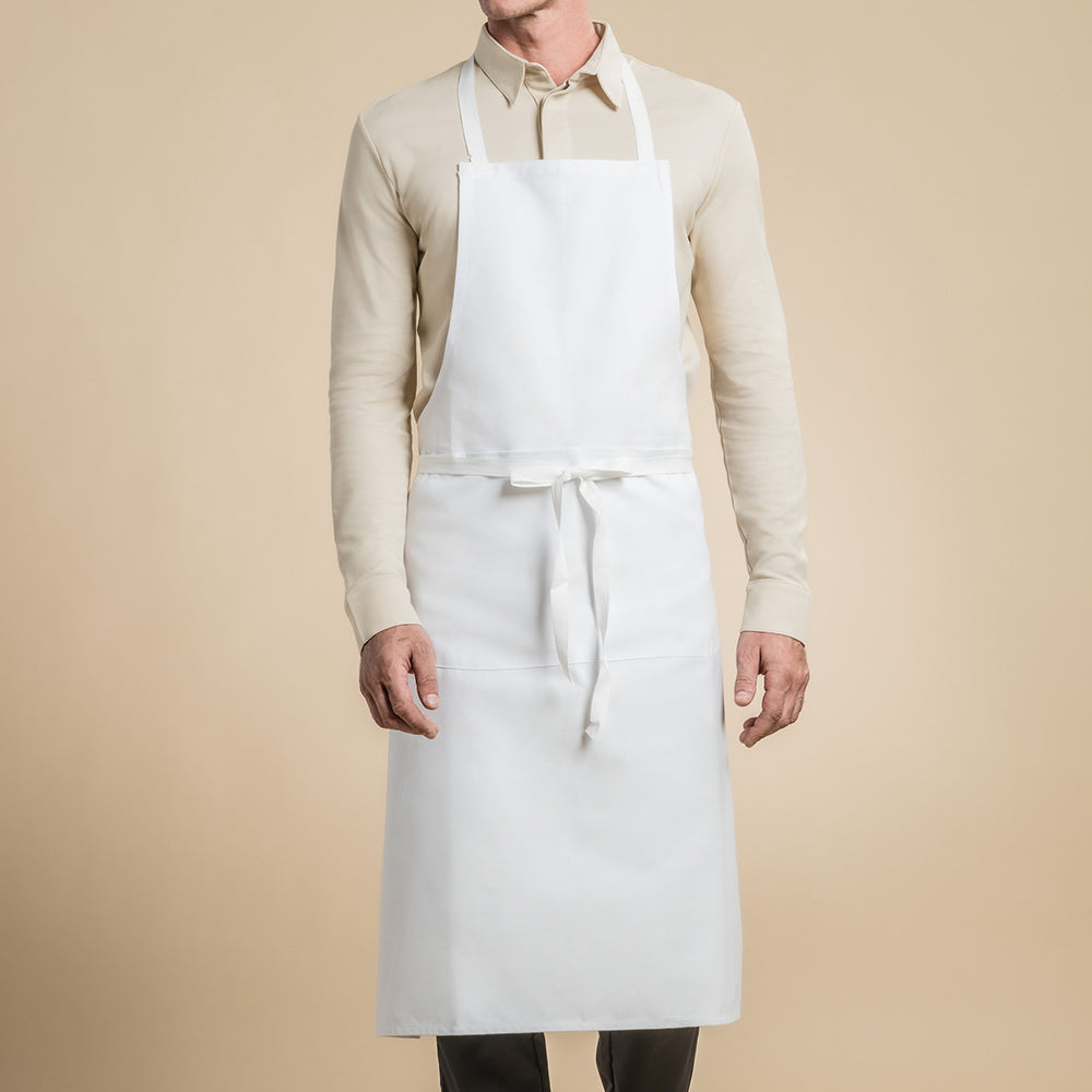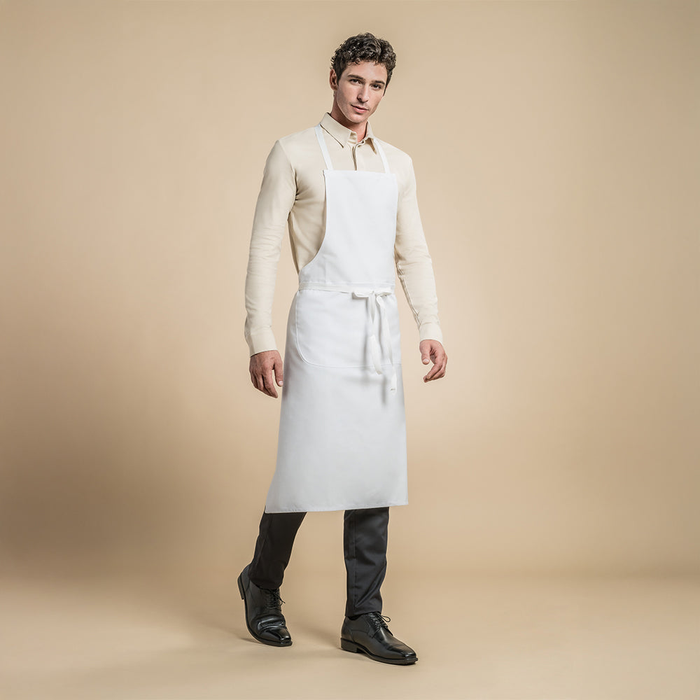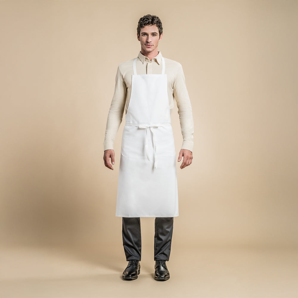 Bib apron with strap fastening. Kangaroo pocket. Fabric : 50% polyester 50% cotton One size : 100 cm long - 100 cm wide.