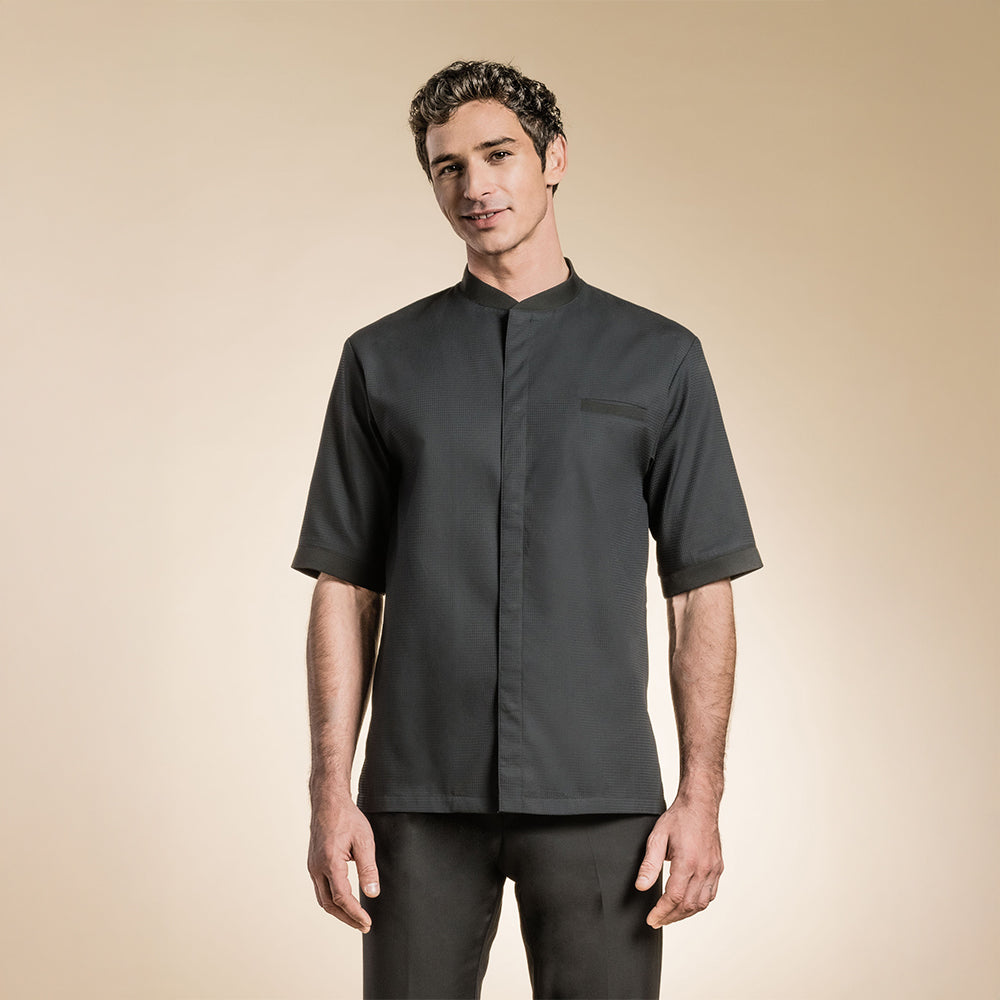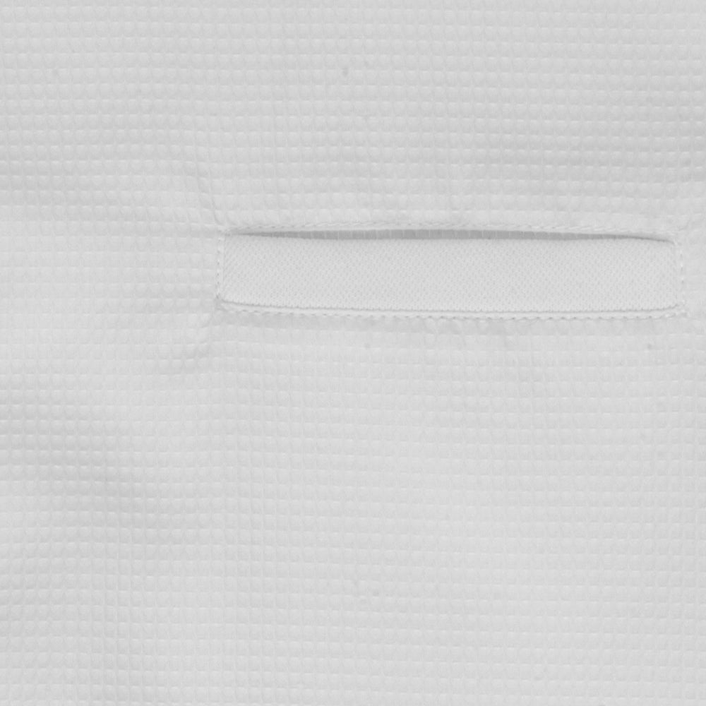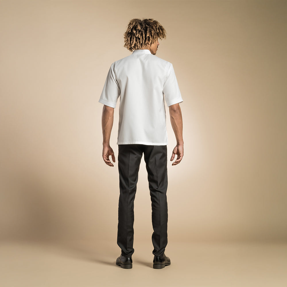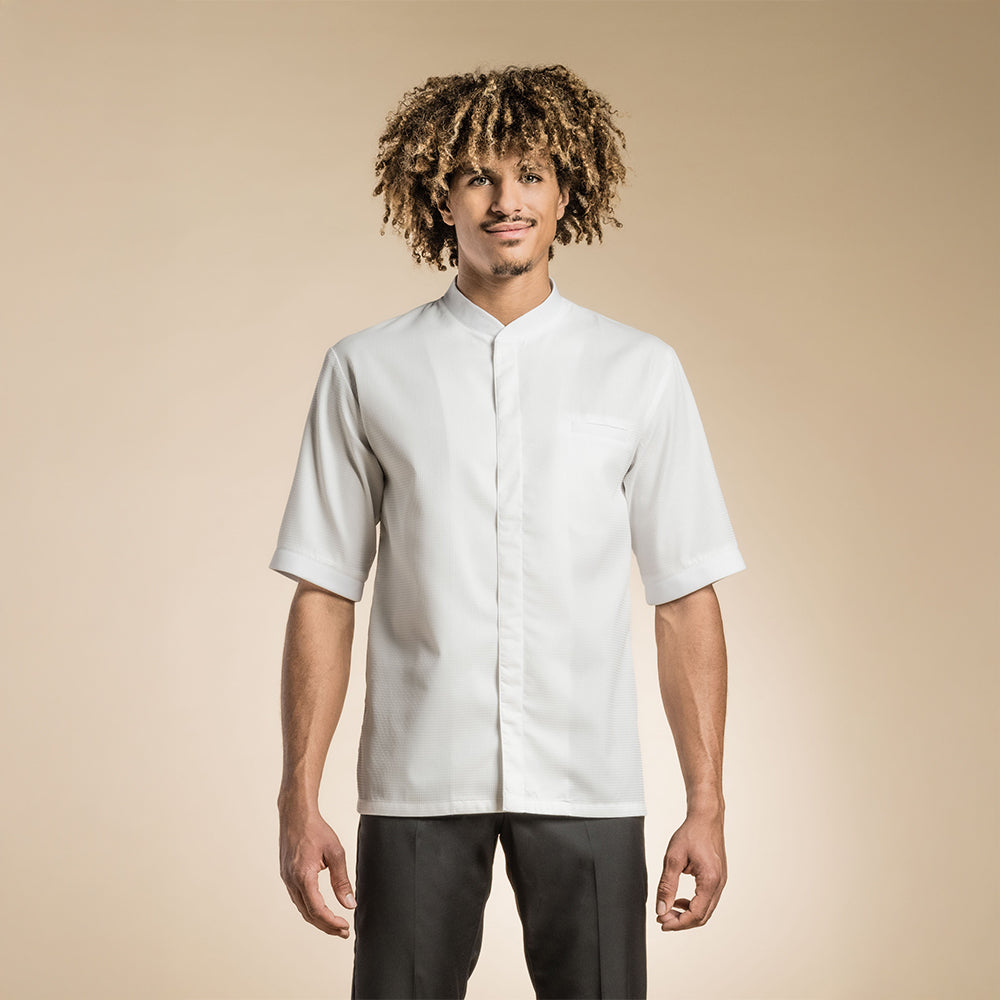 Men's comfortable chef jacket: Features a light and comfortable honeycomb material. Hidden snap buttons in the middle front, welt pocket on chest, side slits.