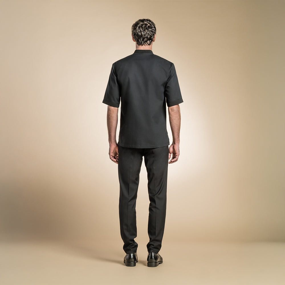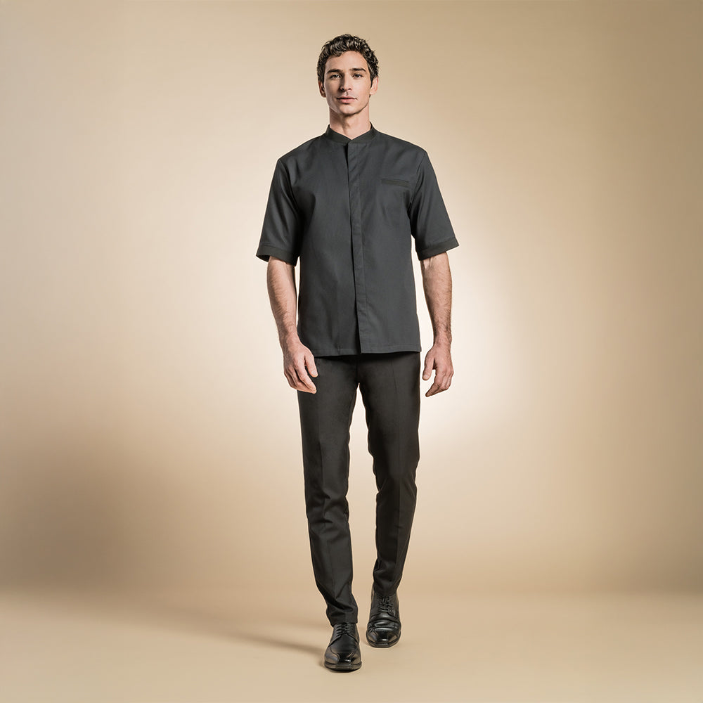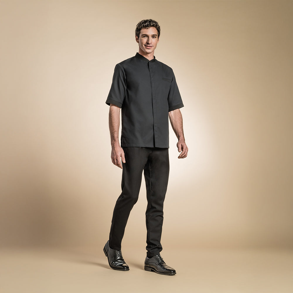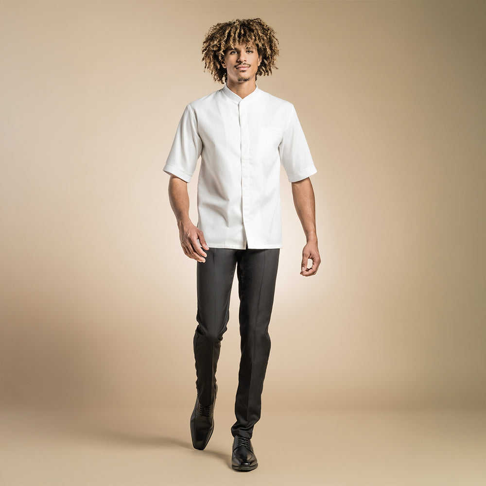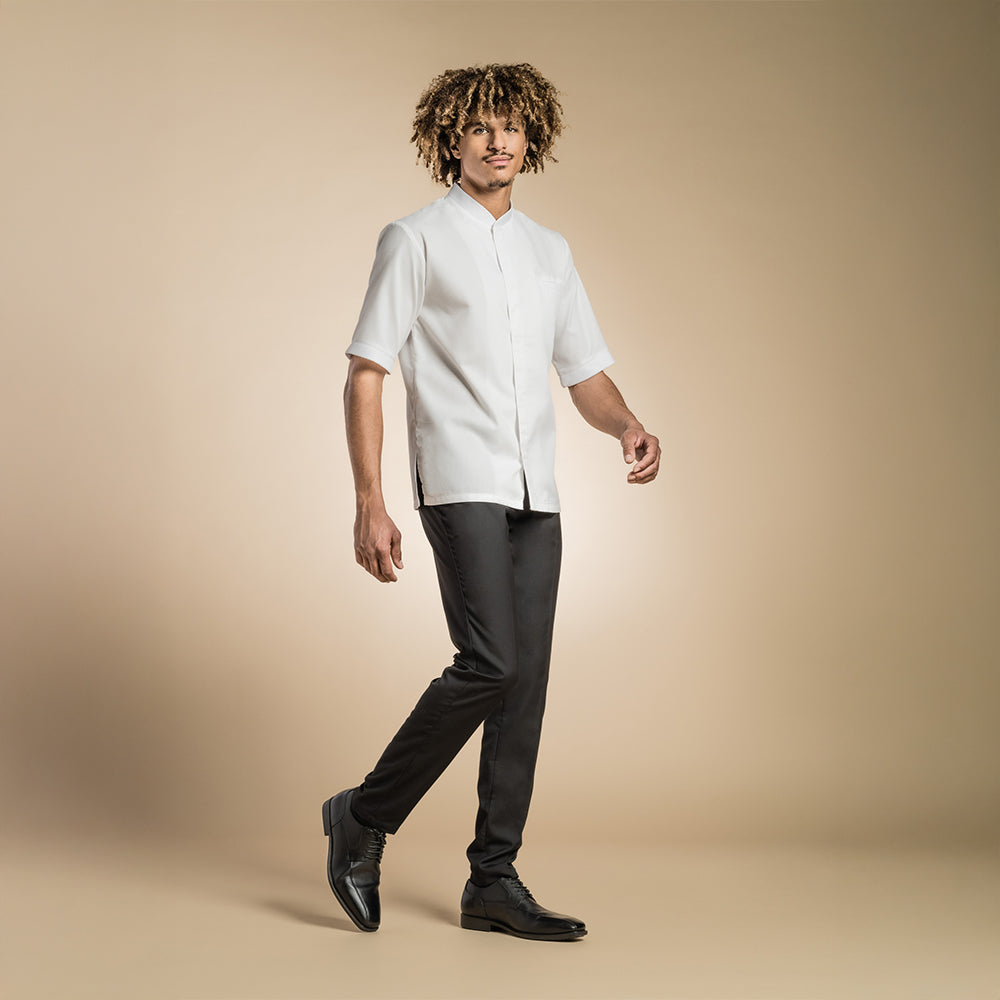 Men's comfortable chef jacket: Features a light and comfortable honeycomb material. Hidden snap buttons in the middle front, welt pocket on chest, side slits.