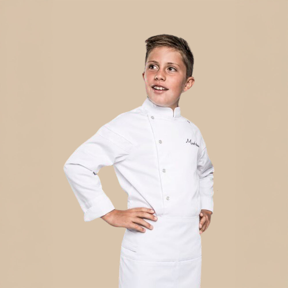Children's professional chef jacket with an officer collar. Raglan sleeves. Side fastening. Pearly Snap Button.