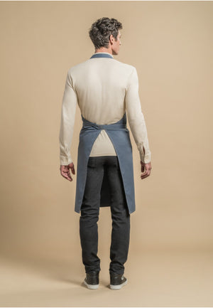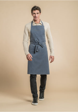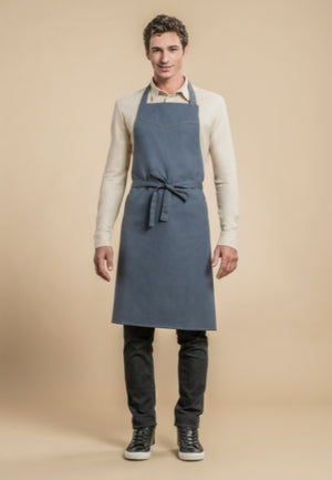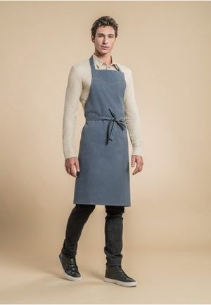 Denim bib apron. Adjustable neck strap. Contrasting caramel colored topstitches. Top yoke shaped in a jean styled way.