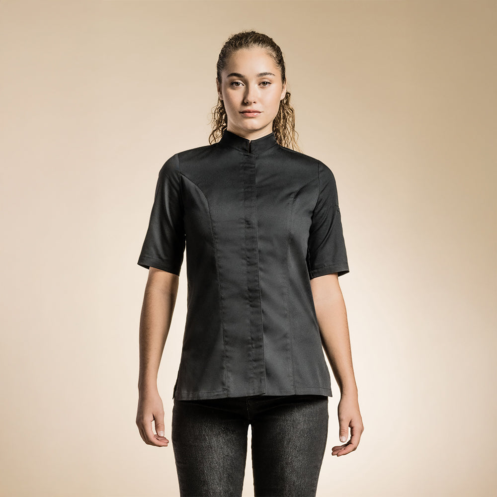 This sleek Women's Genova Chef Jacket is designed with style and functionality in mind. The officer collar and hidden snap buttons add a professional touch, while the side slits allow for ease of movement and ventilation in the kitchen. Customize your jacket with the C-YOU concept, featuring a 2.5 cm strip along each shoulder down to mid-arm. Available in sizes T00 to T6 with short or long sleeves, and in white and black, this chef jacket is a must-have for any culinary professional