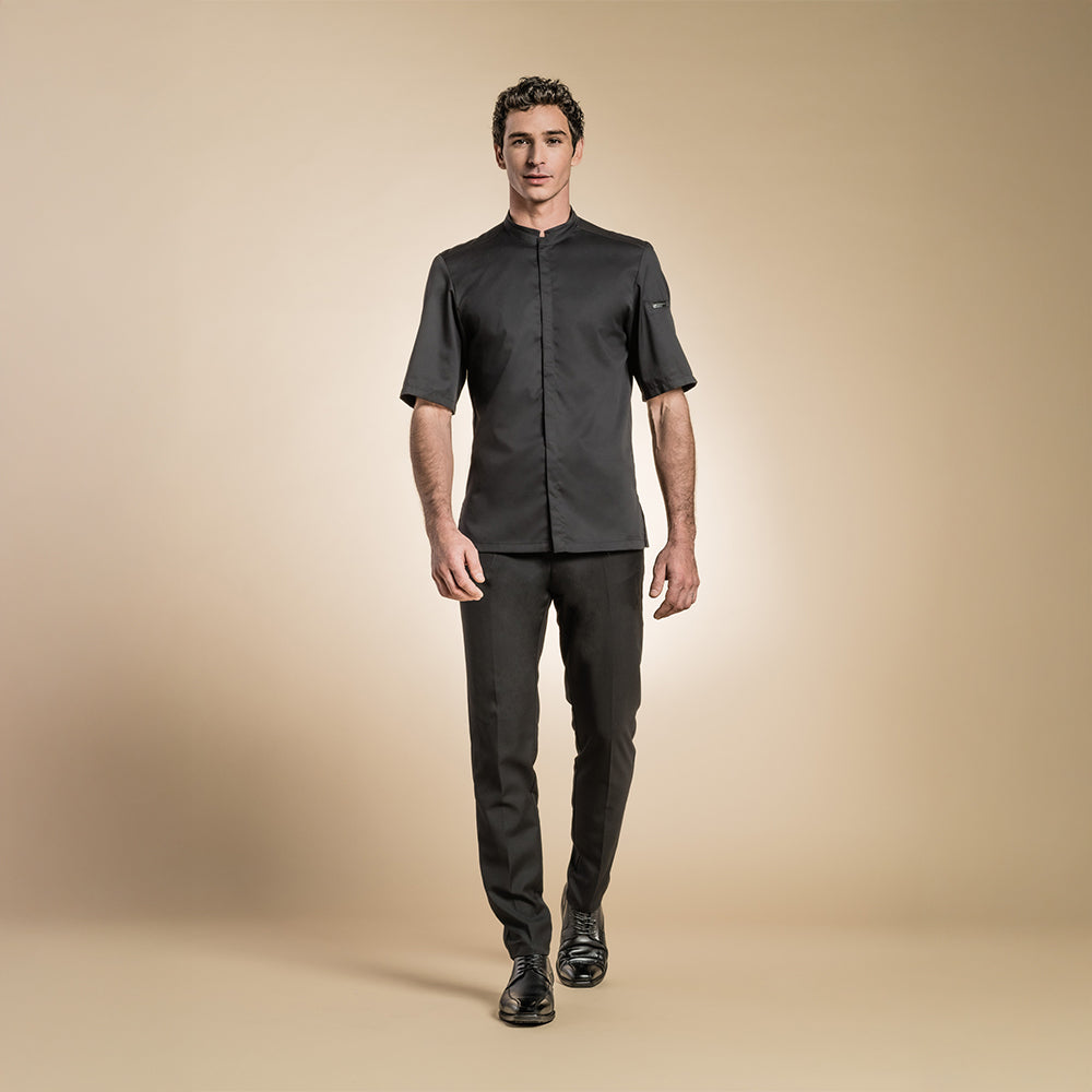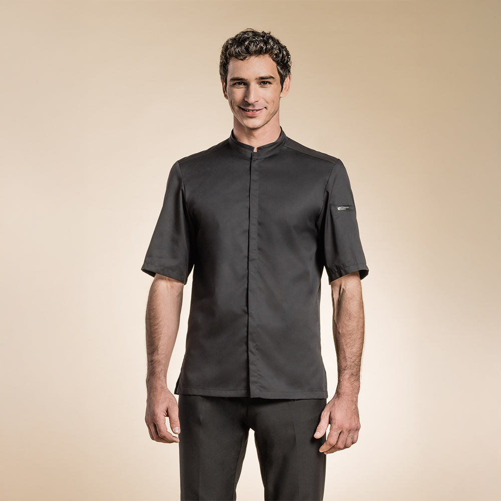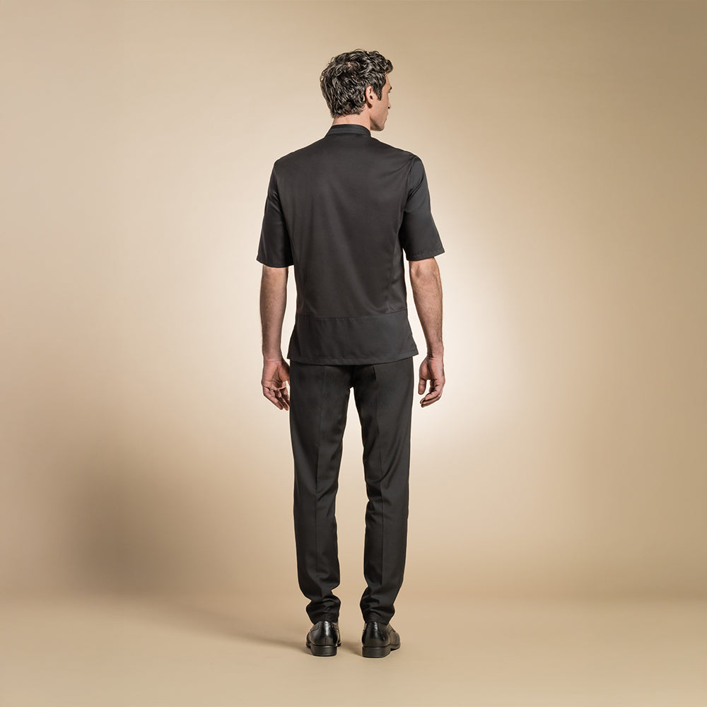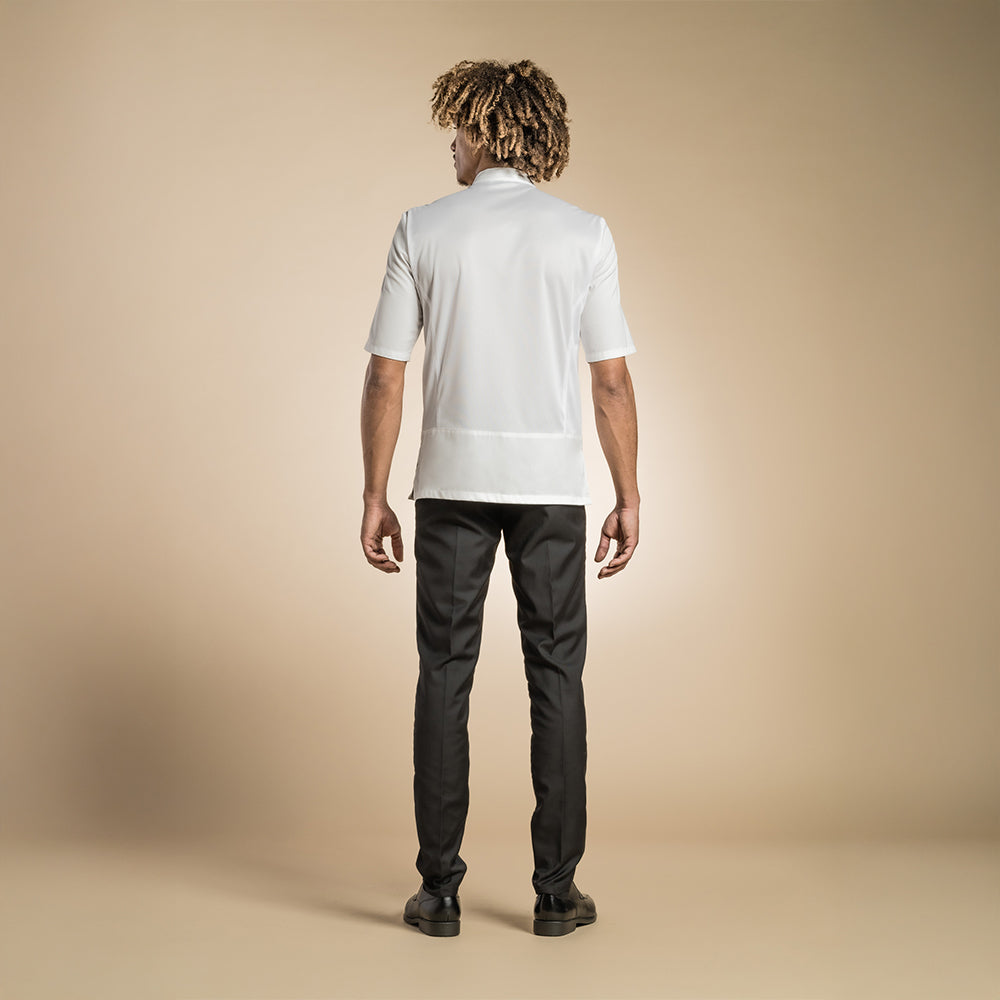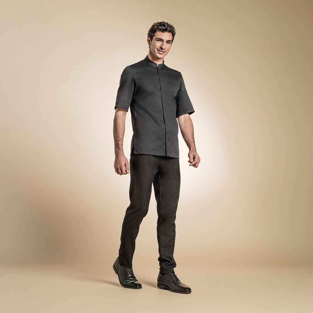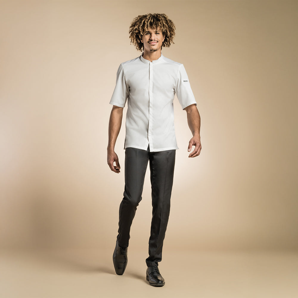 Men’s chef jacket with officer collar in two parts. Central front fastening. Hidden snap buttons. Pen pocket on left sleeve. Side slits
