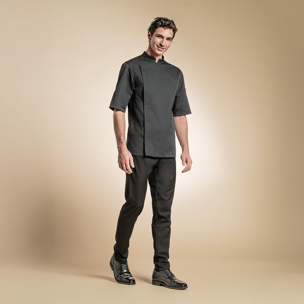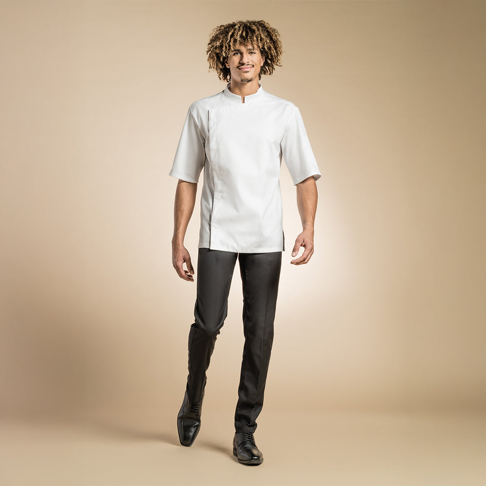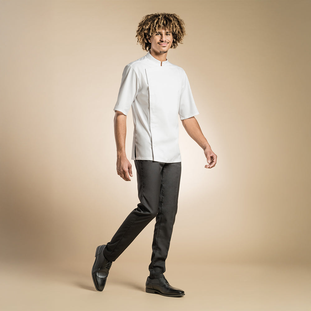 This sleek Men's Liverpool Chef Jacket is designed with style and functionality in mind. The square mandarin collar and hidden snap fastening add a professional touch, while the pen pocket and side slits allow for convenience and ease of movement in the kitchen. Customize your jacket with the C-YOU concept, featuring a 1 cm strip along the front yoke. Available in sizes T00 to T8 with short or long sleeves, this chef jacket is a must-have for any culinary professional.