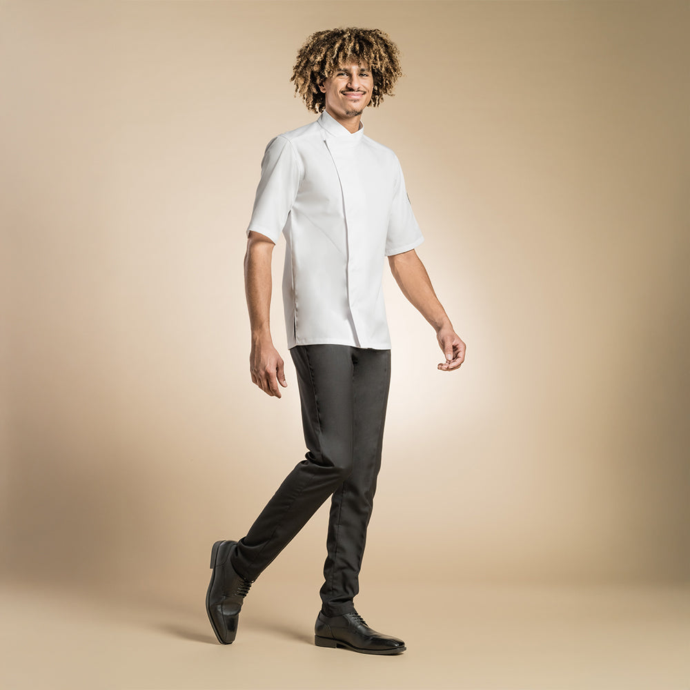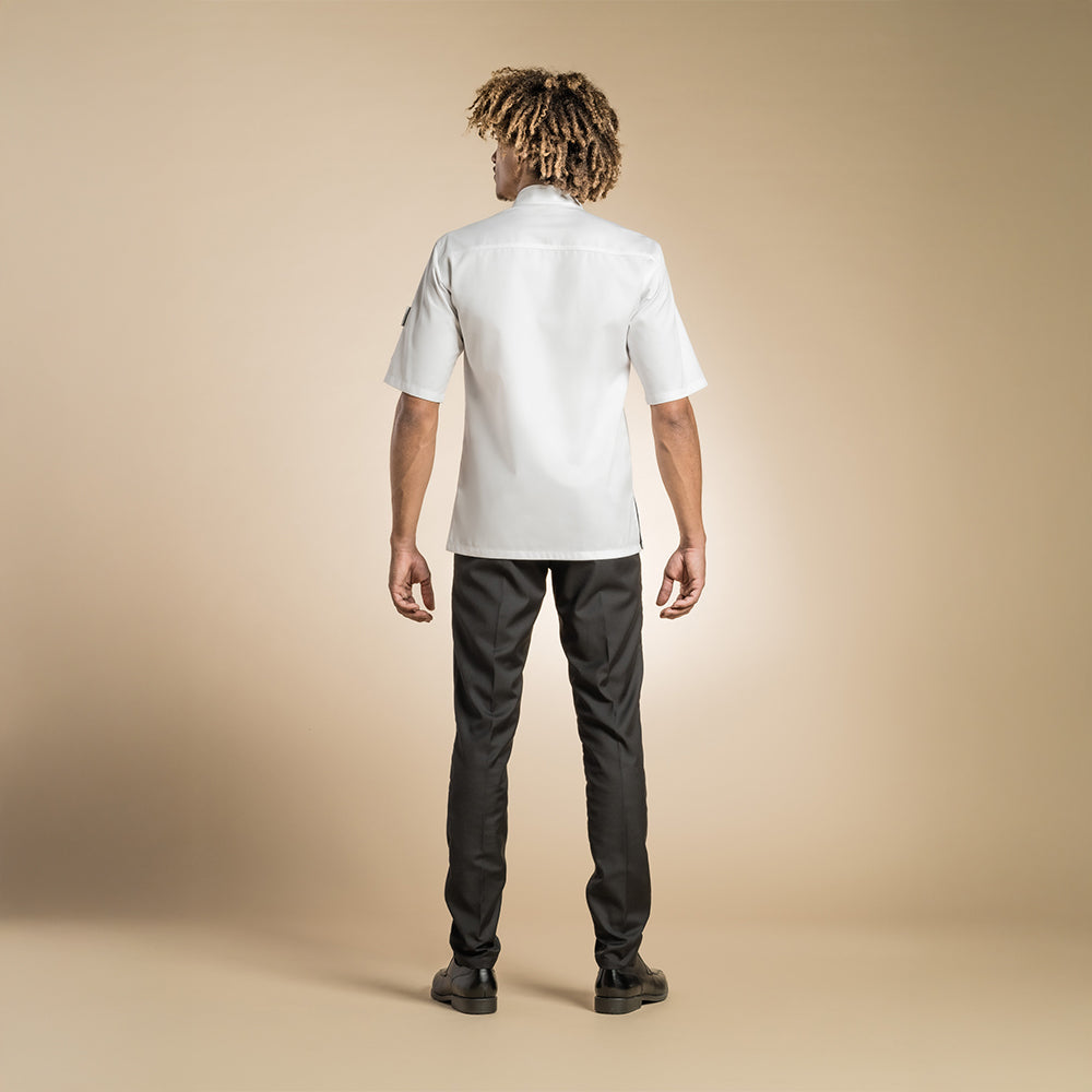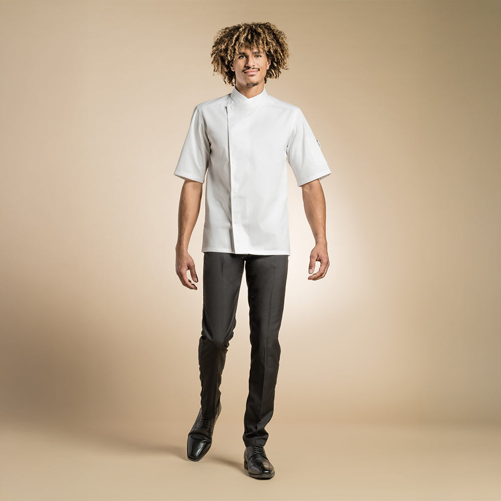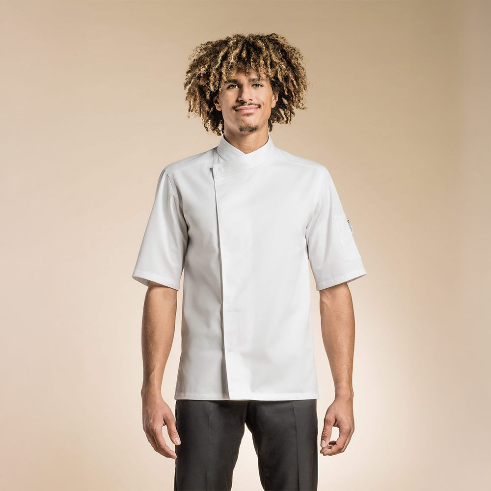 Men's high-quality chef jacket with a kimono collar, hidden snap buttons, a pen pocket on the left sleeve, and side slits to promote airflow.