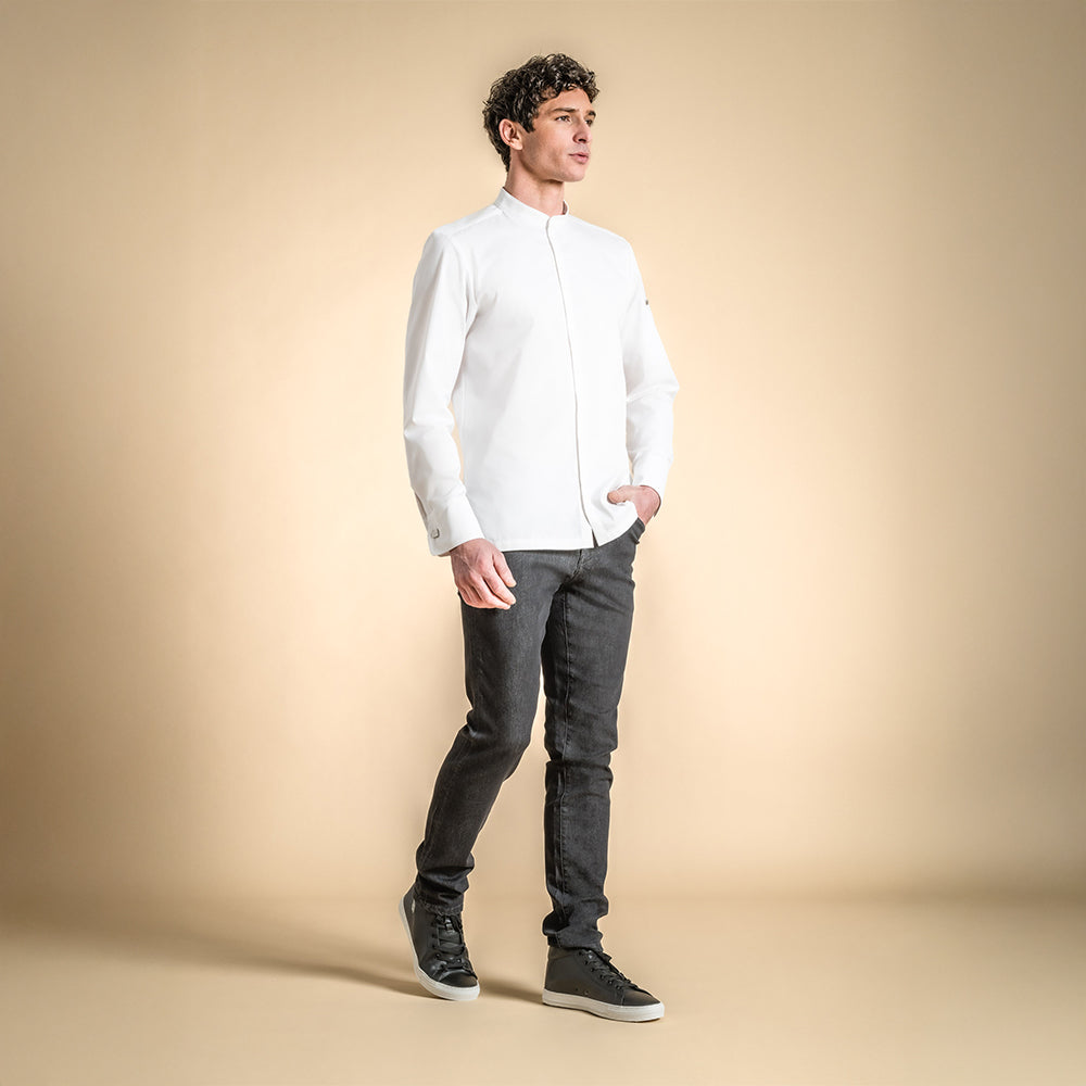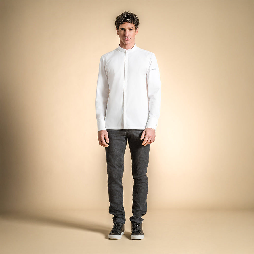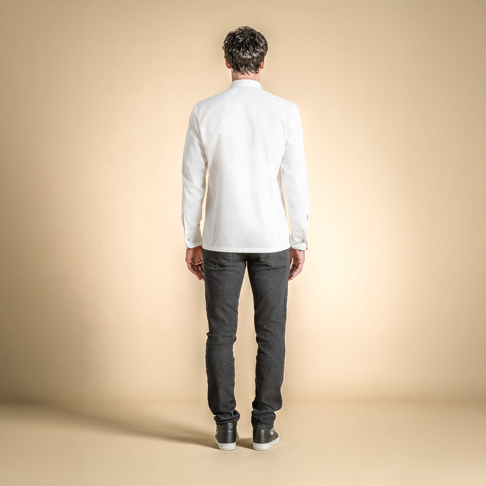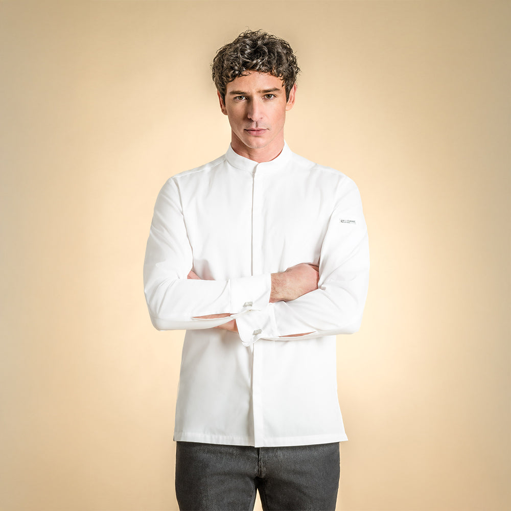 Men's chef jacket with Mao mandarin collar. Central front fastening. Hidden snap buttons. Pen pocket on left sleeve. Wrist musketeer and inox cufflinks with CD marked. Side slits.