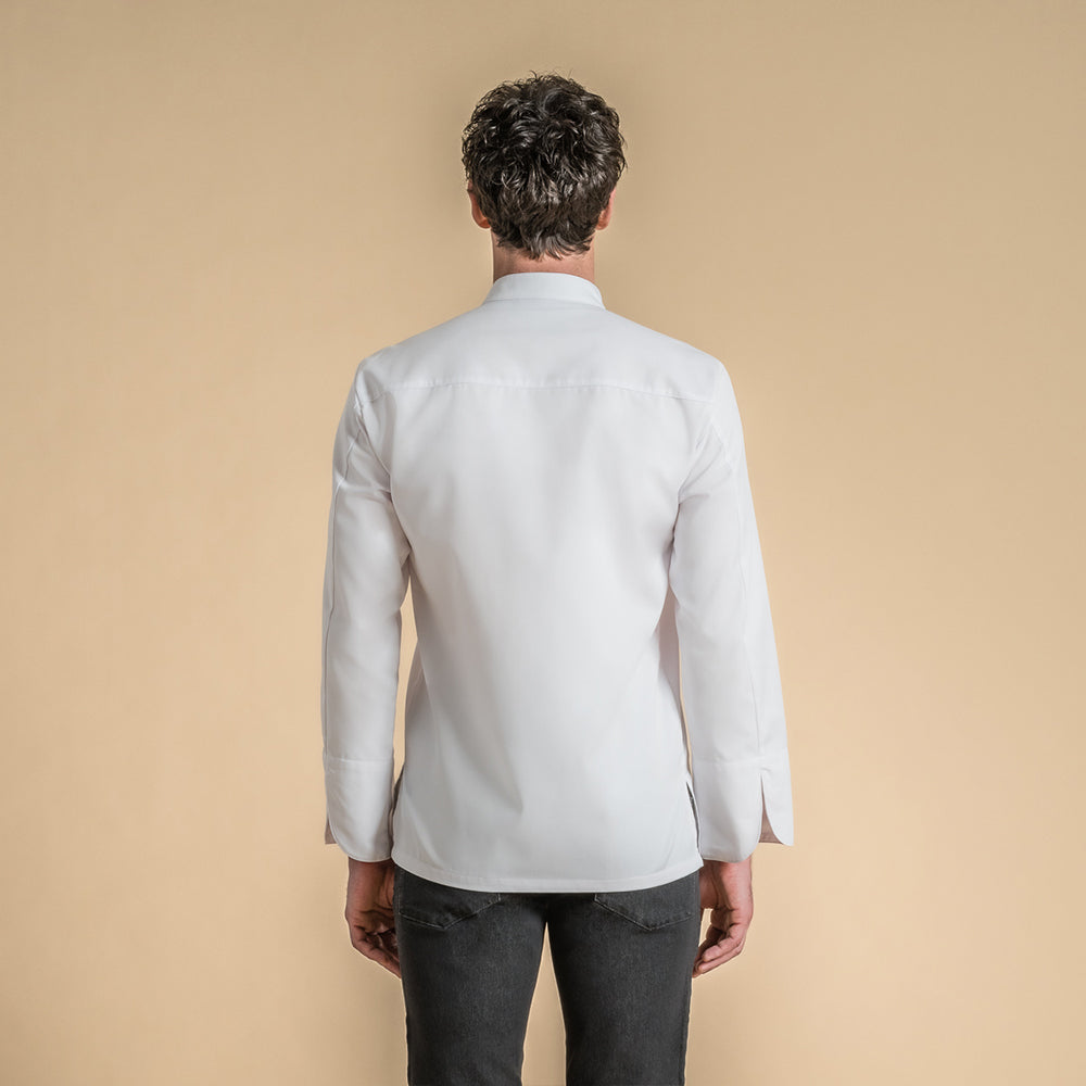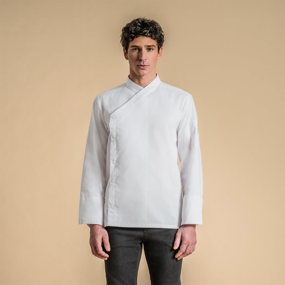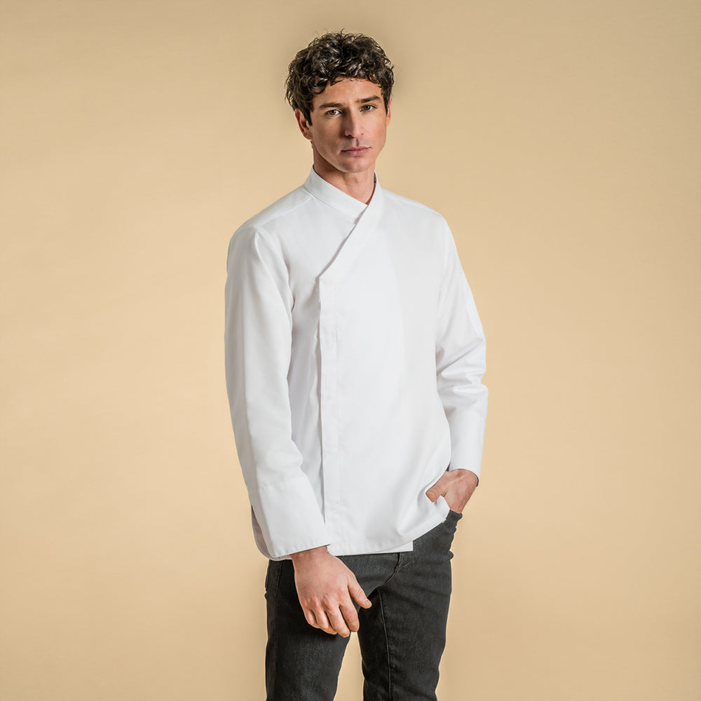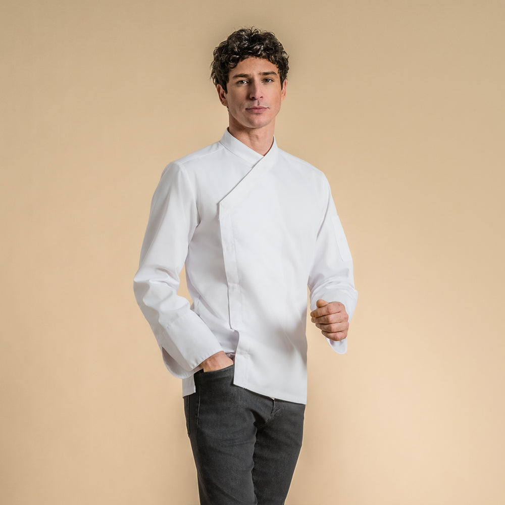 Men's chef jacket with kimono collar. Side fastening. Hidden snap buttons. Pen pocket on left sleeve. Side slits.