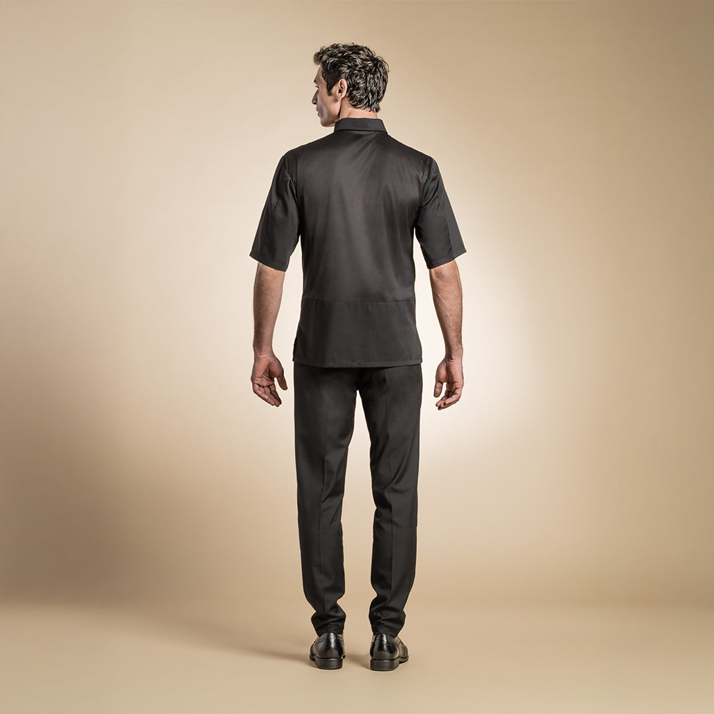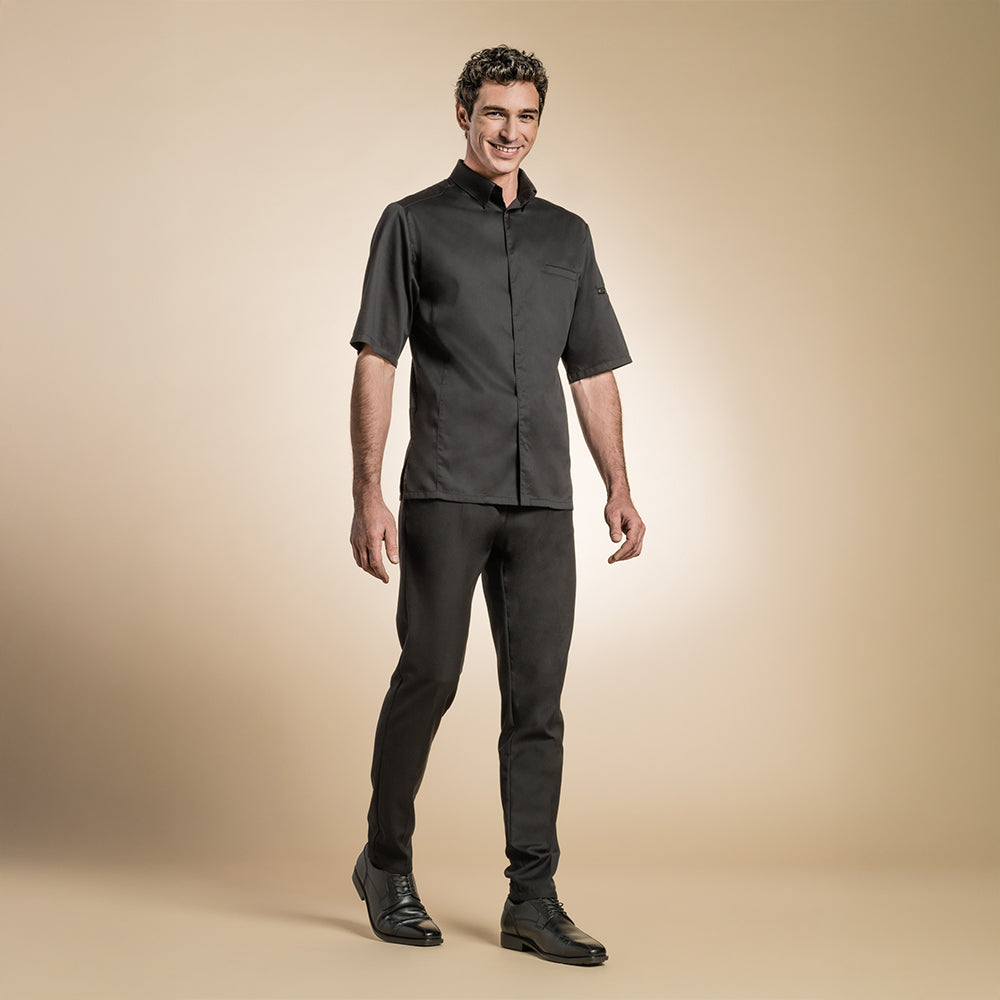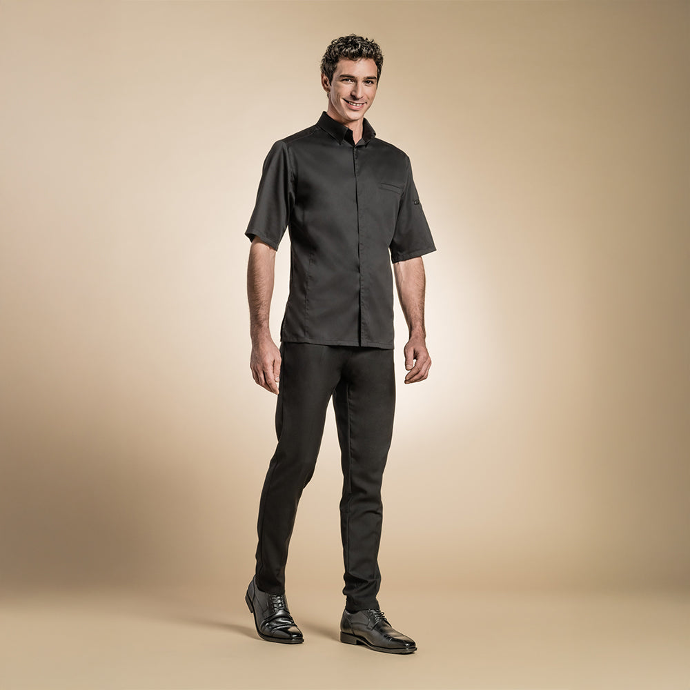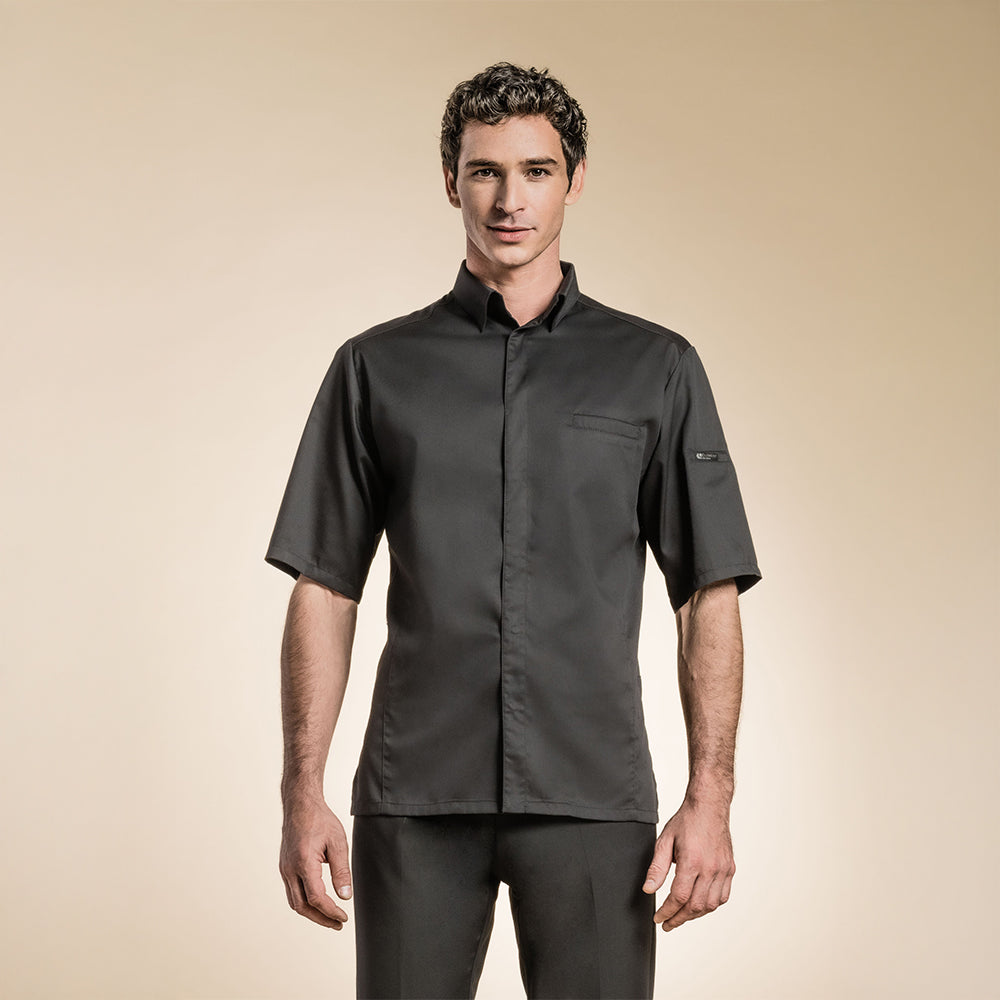 Men's Premium French Chef Jacket features a shirt collar, hidden snap buttons, a single welt pocket on the front, a pen pocket on the left sleeve, and side slits that offer enhanced airflow. This model is more of a standard fit.