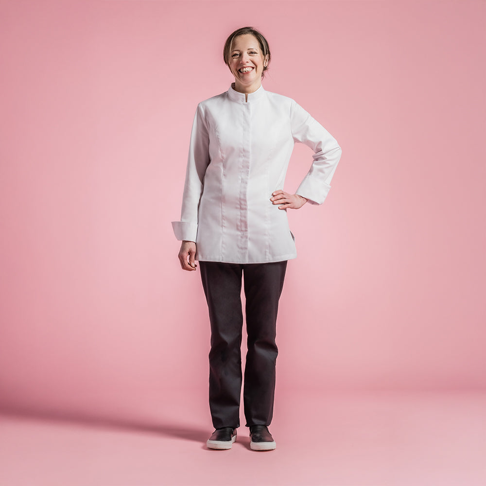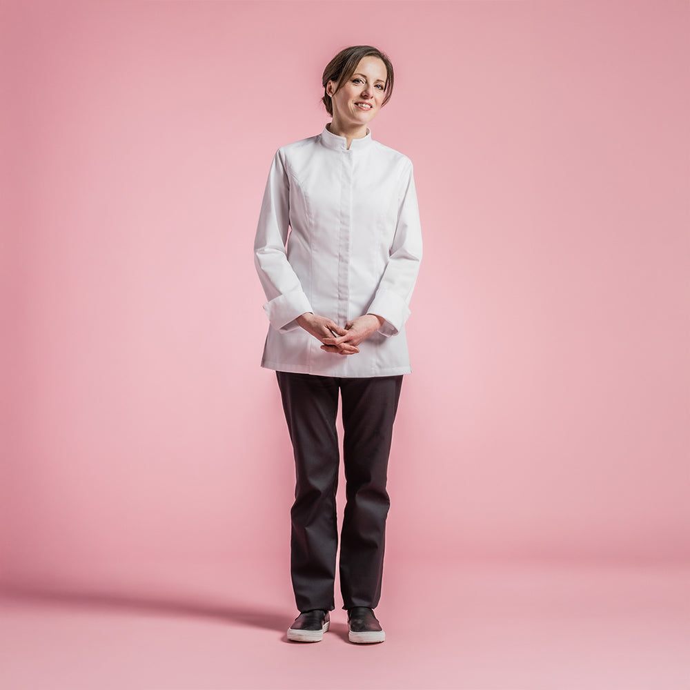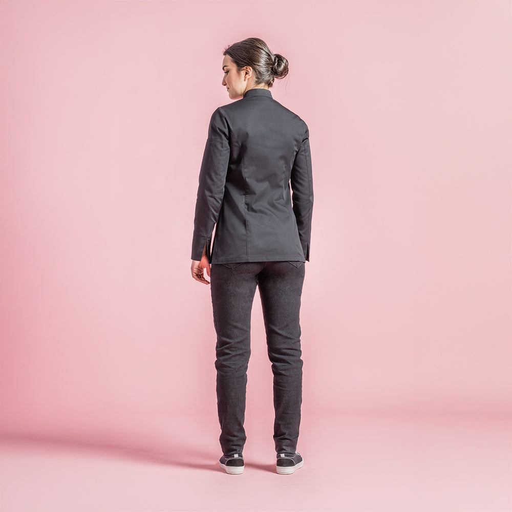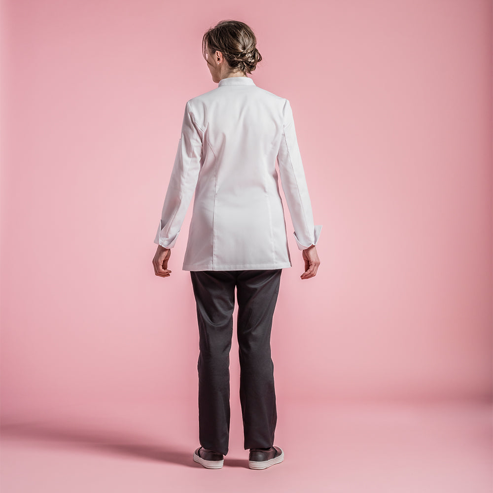 Women's chef jacket with officer collar. Central front fastening. Hidden snap buttons. Welt pocket on left of chest. Pen pocket on left sleeve. Side slits.