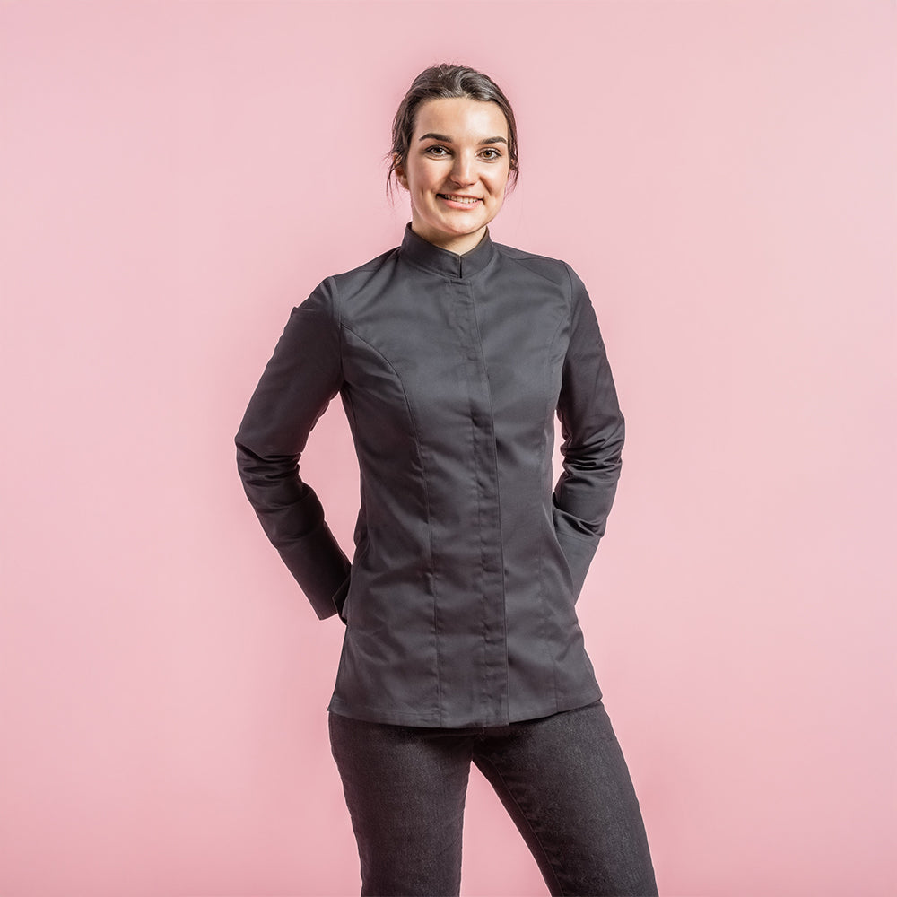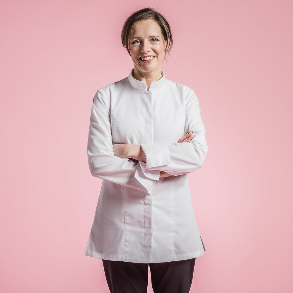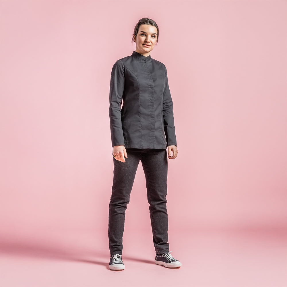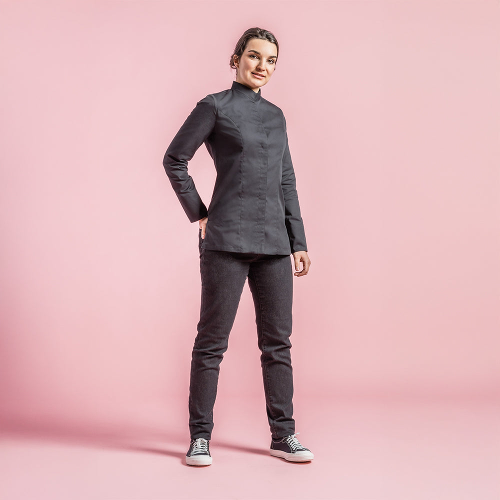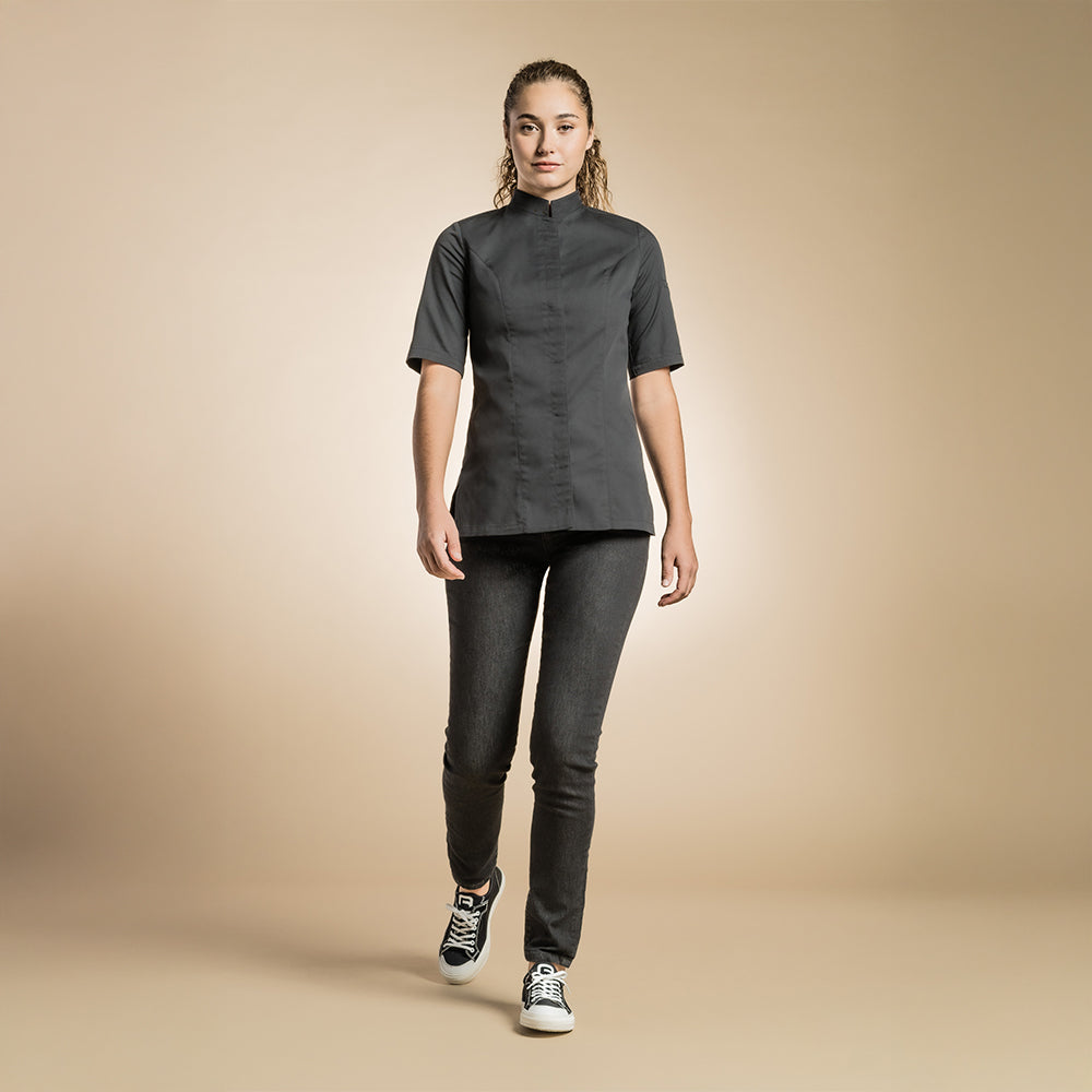 Women's chef jacket with officer collar. Central front fastening. Hidden snap buttons. Welt pocket on left of chest. Pen pocket on left sleeve. Side slits.
