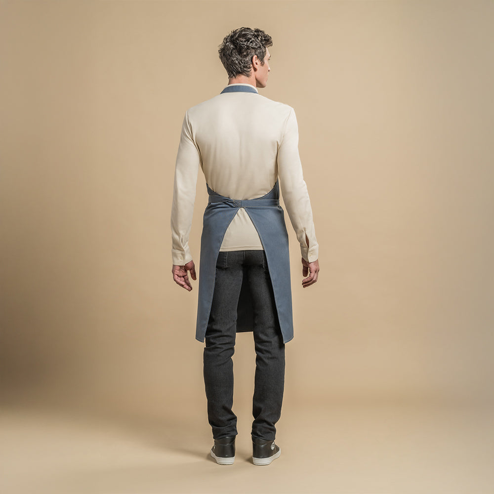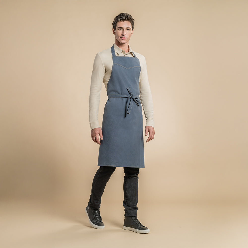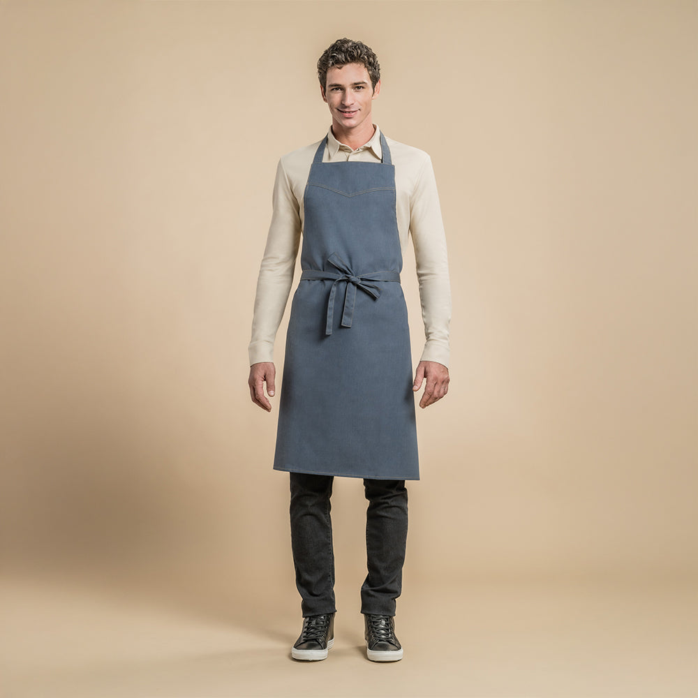 Denim bib apron. Adjustable neck strap. Contrasting caramel colored topstitches. Top yoke shaped in a jean styled way.