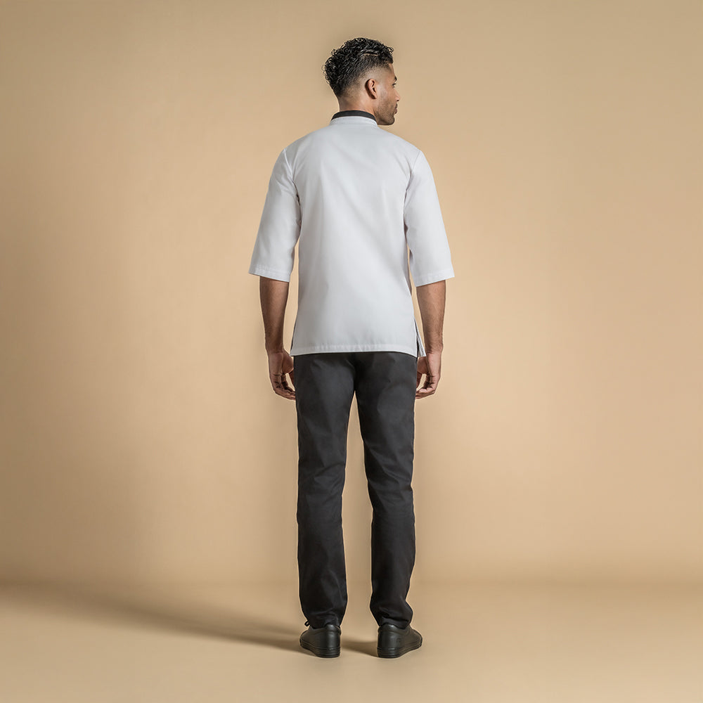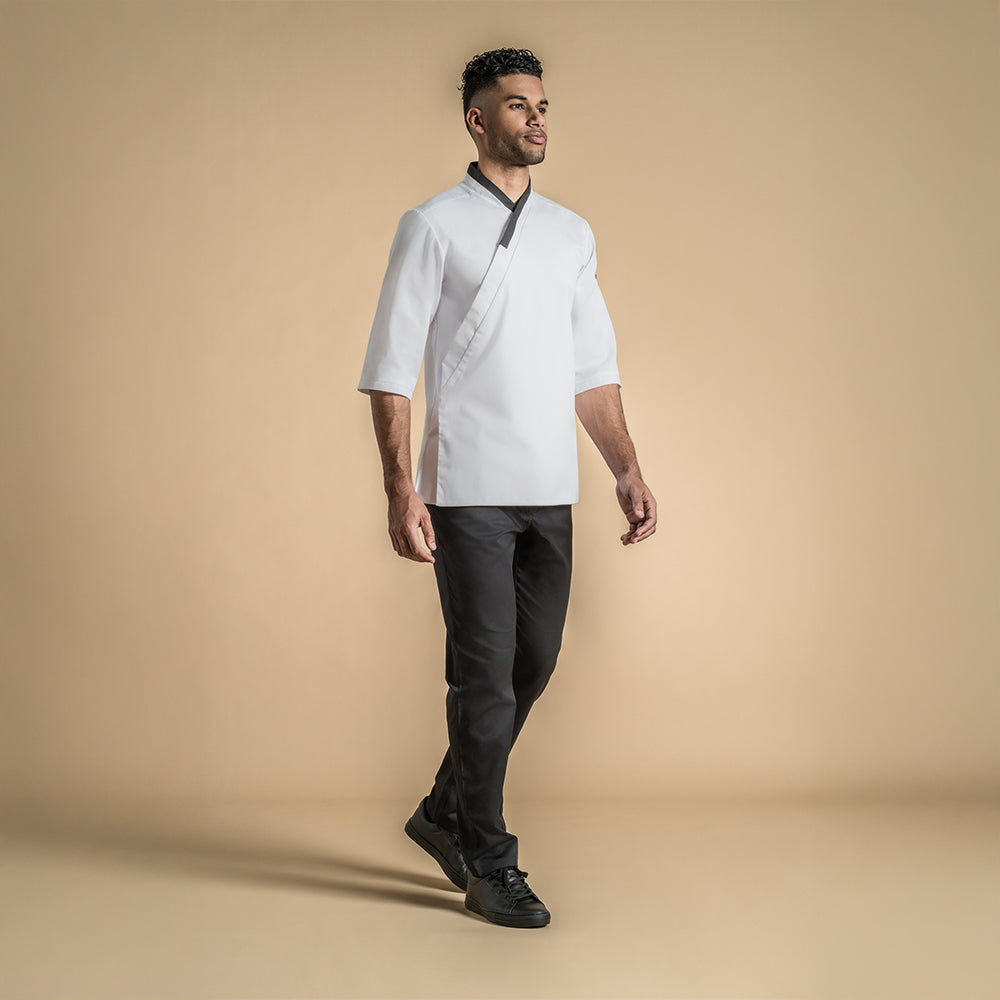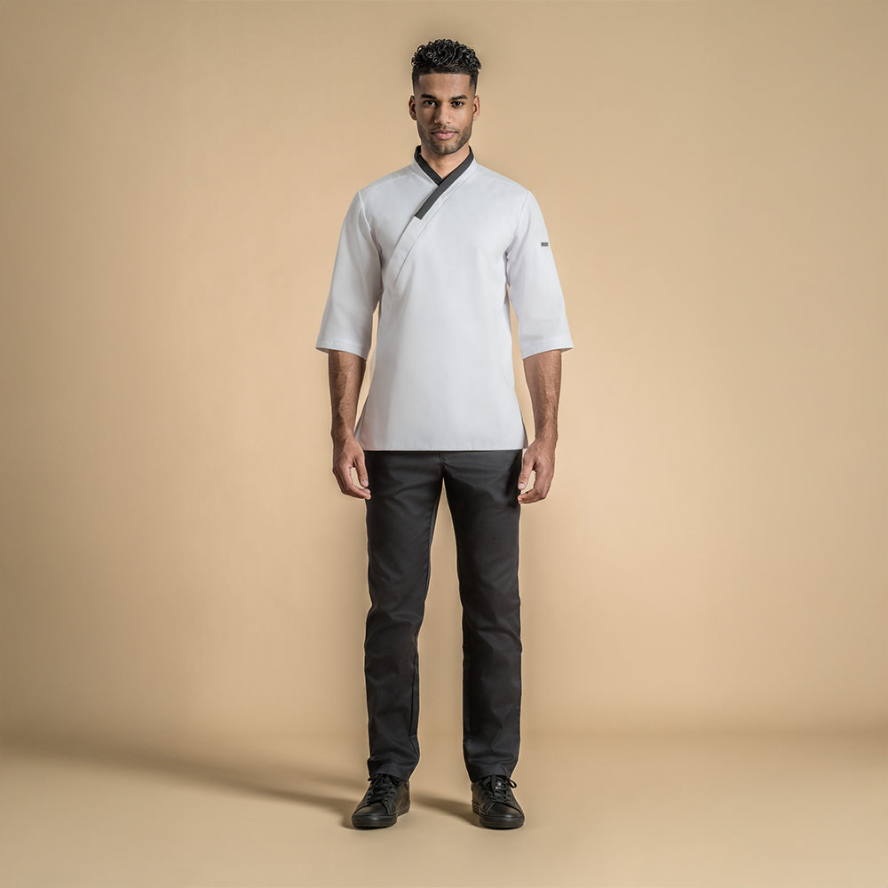 Men's kimono chef jacket. Side fastening. Hidden snaps button. Black and white double stripe along the neckline. Side slits.