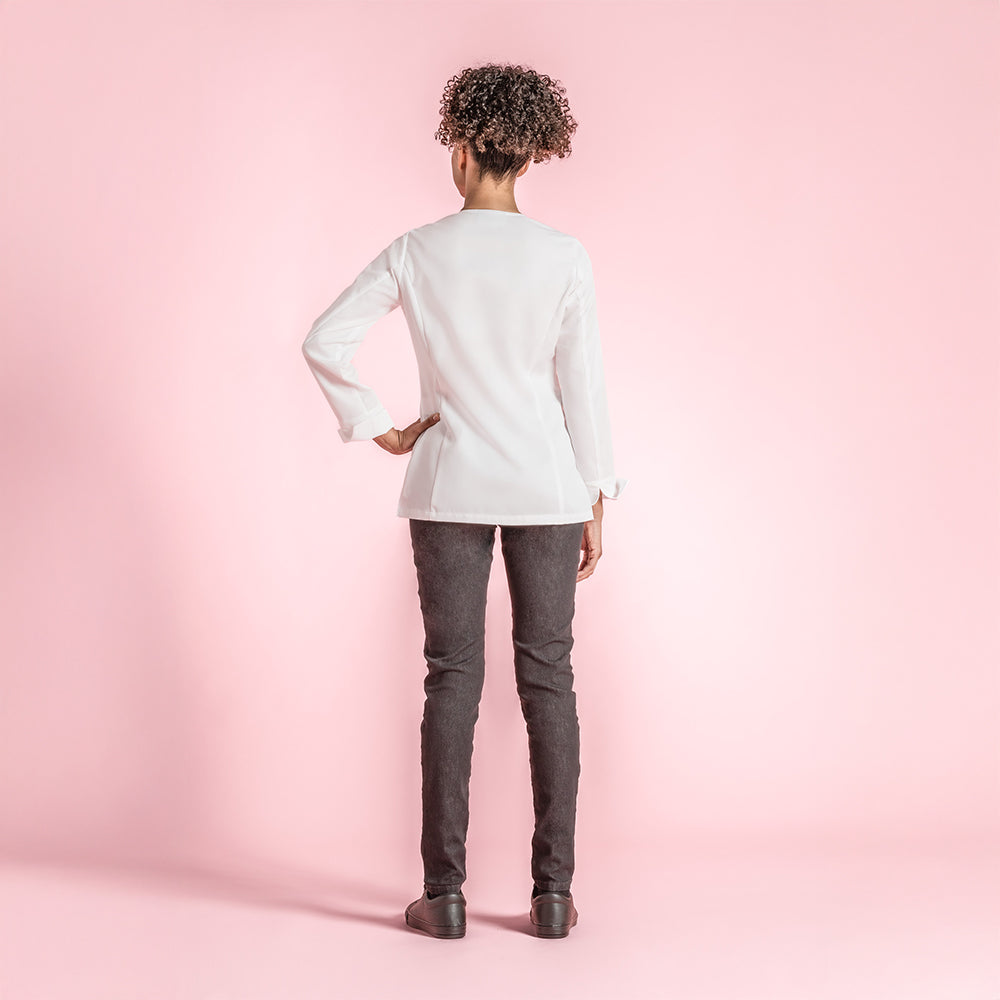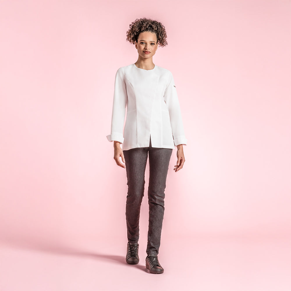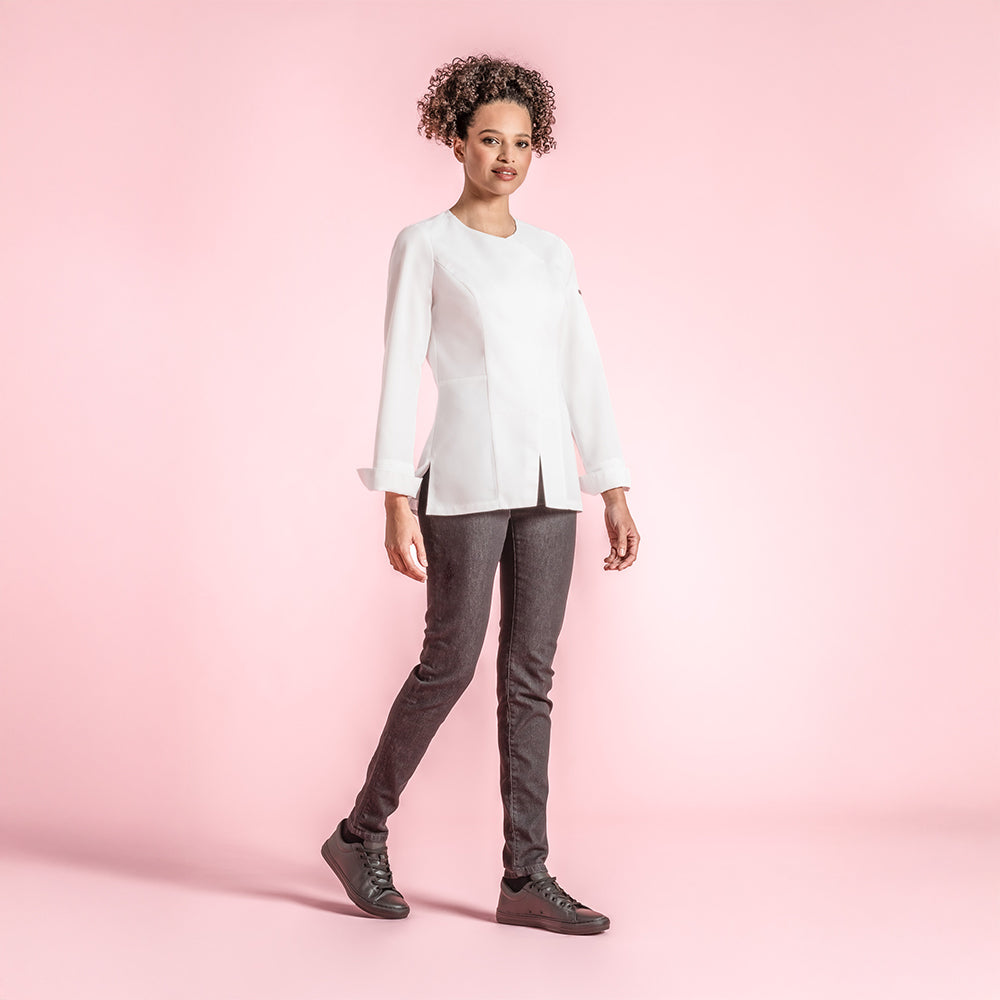 Women's chef jacket. Side fastening. Hidden snap buttons. Horizontal cutout at waist and middle front. Bay cutout on front. Pen pocket on left sleeve. Side slits.