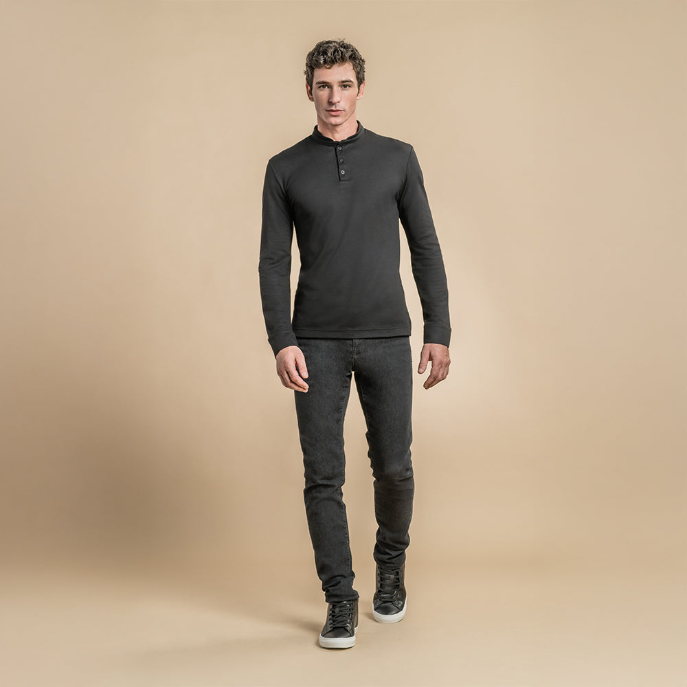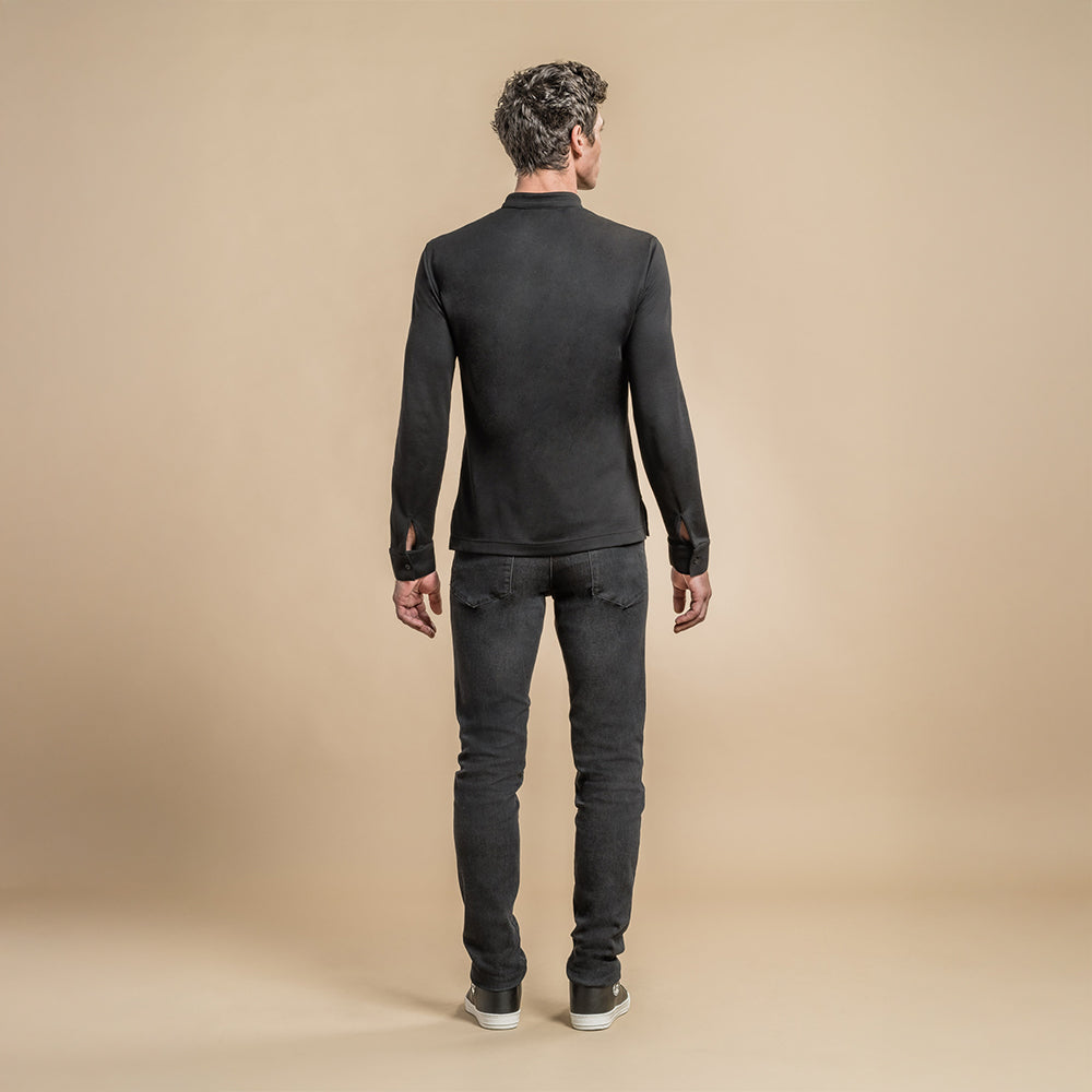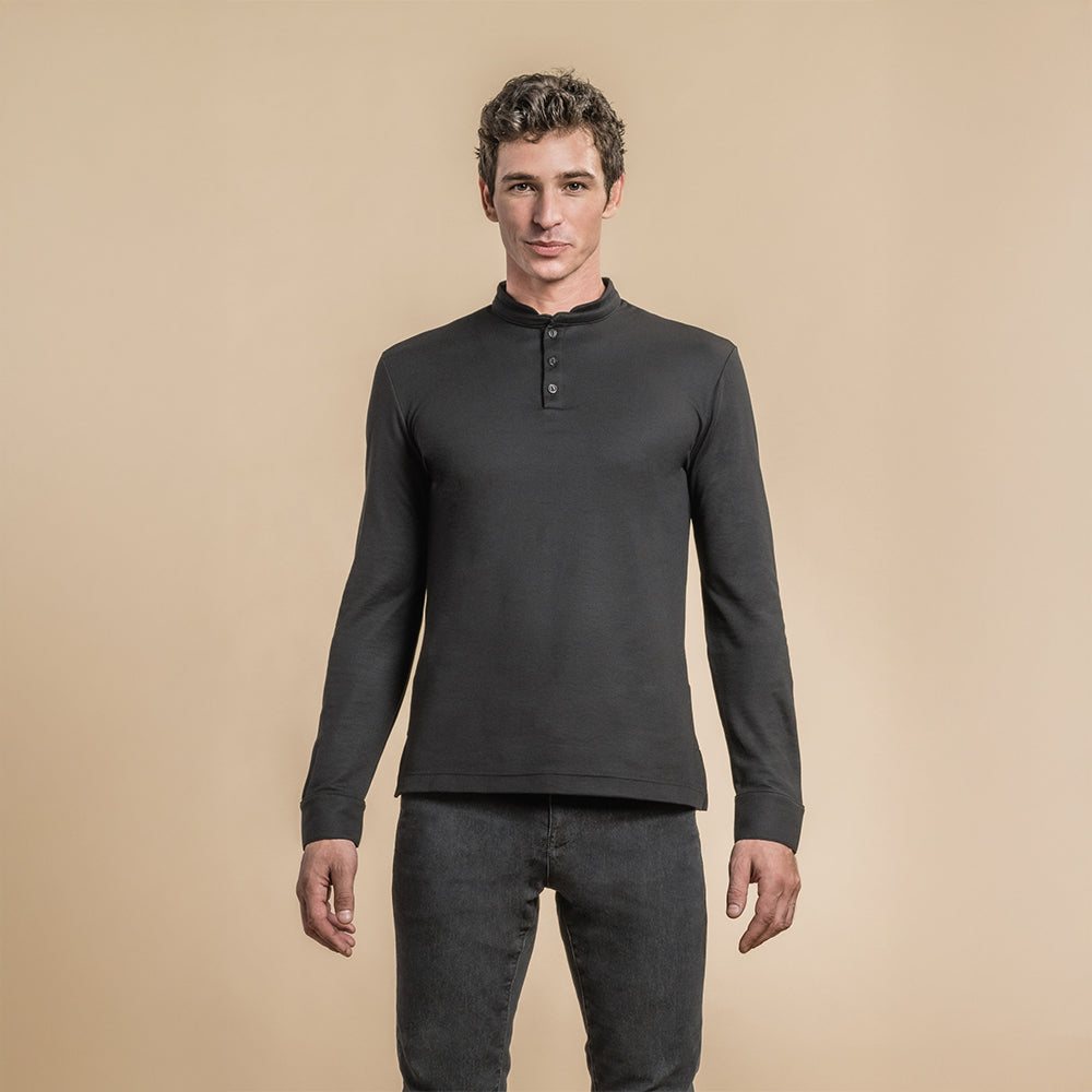 Men's long-sleeve polo shirt with fitted cut and Mao mandarin collar. Three front buttons. Side slits. Breathable mesh,