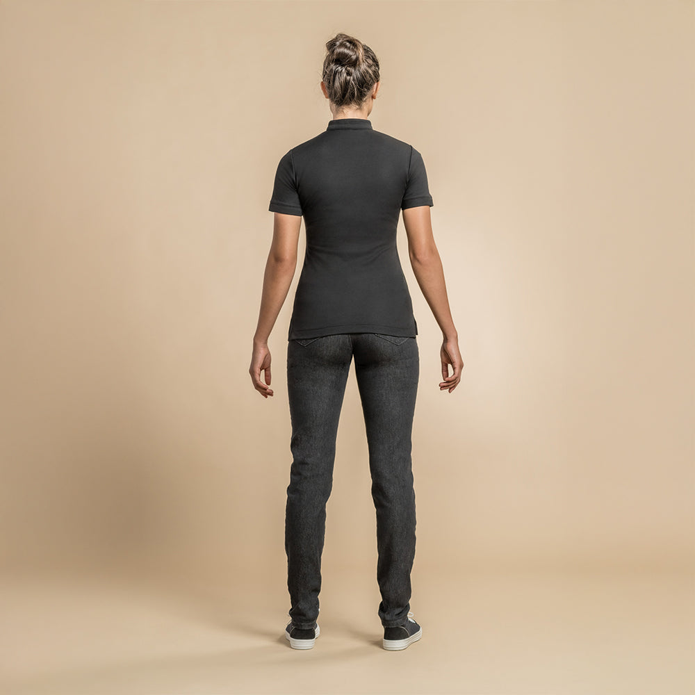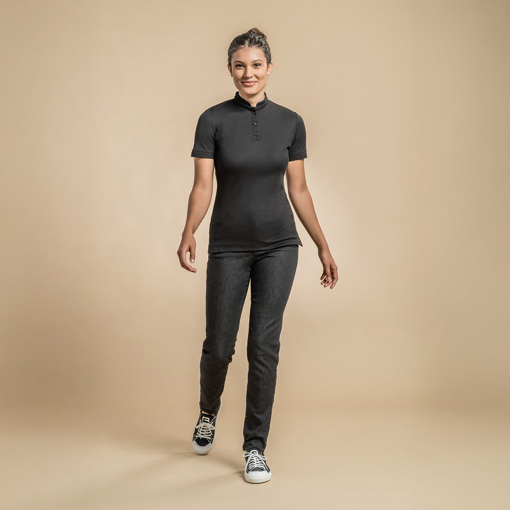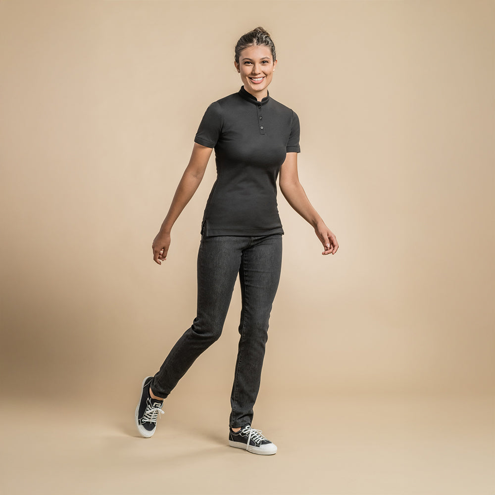 Women's polo shirt with fitted cut and Mao mandarin collar. Three front buttons. Side slits. Breathable mesh,
