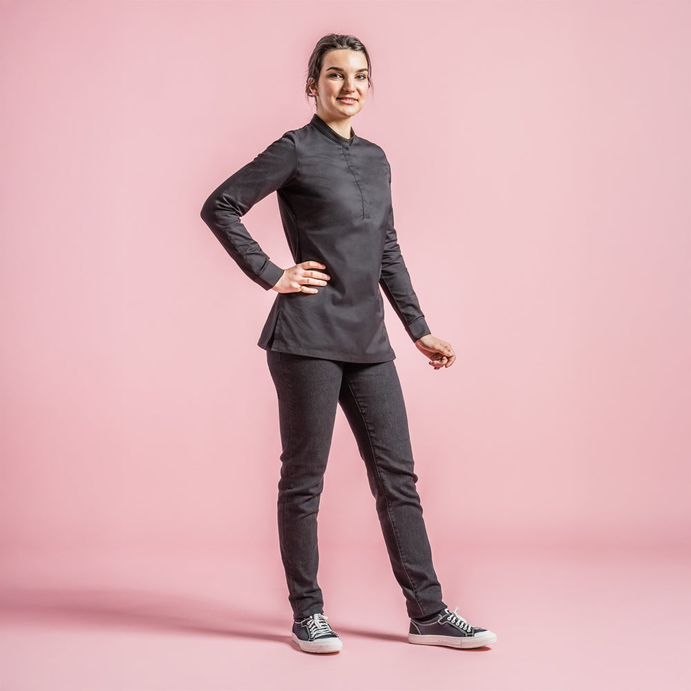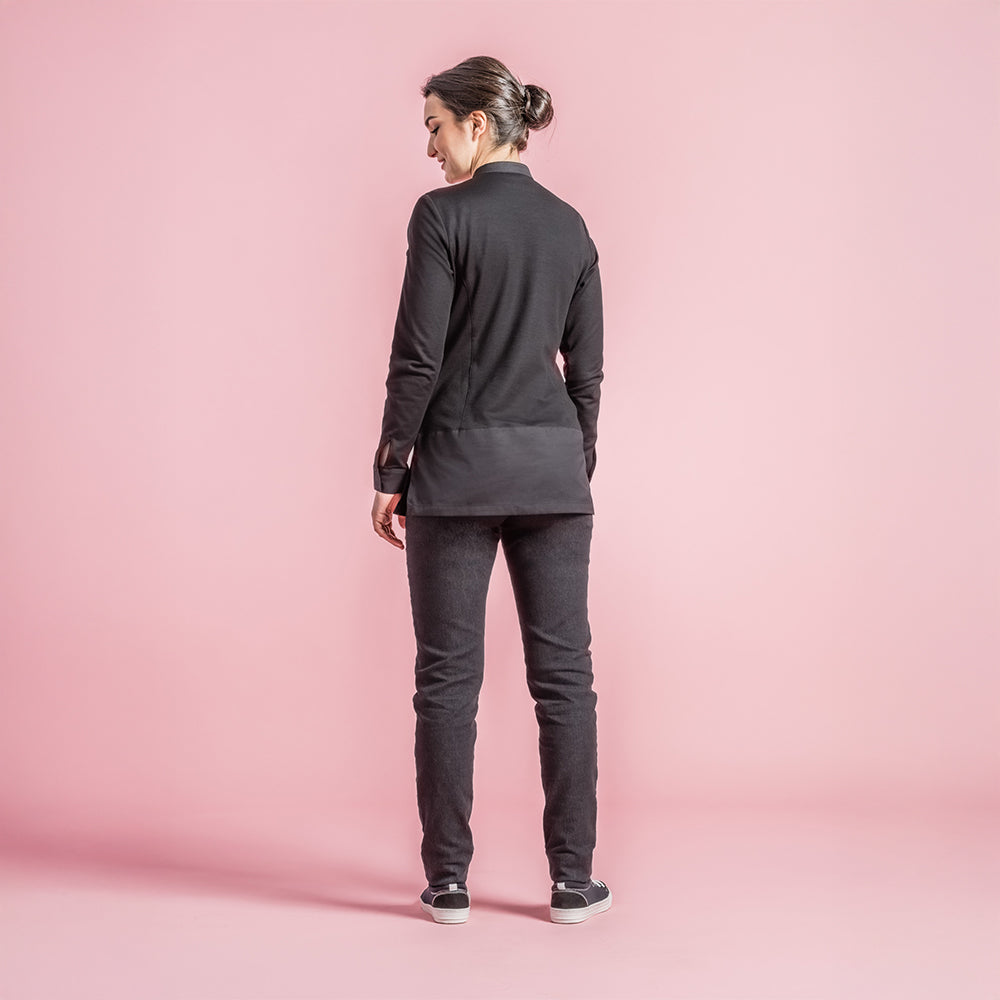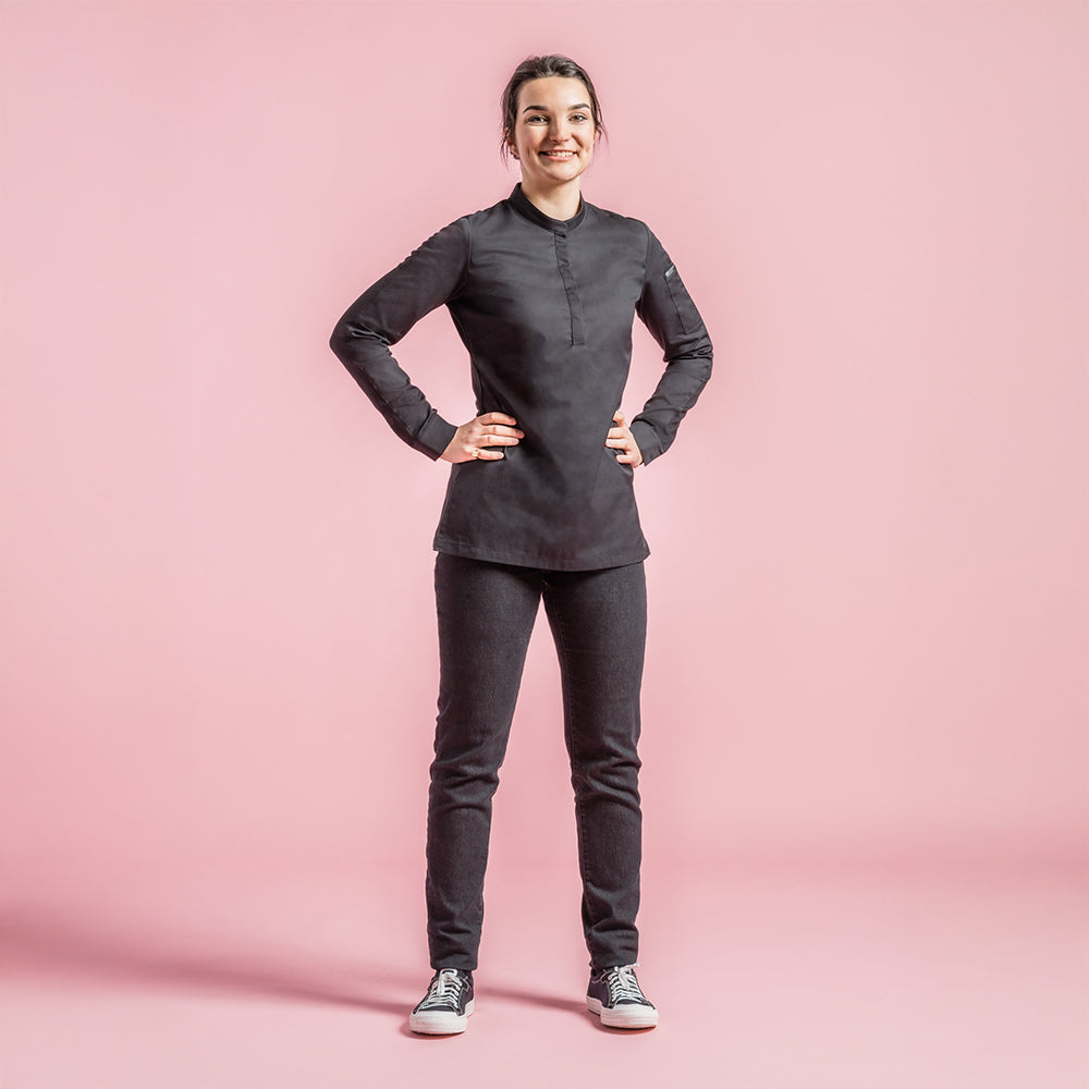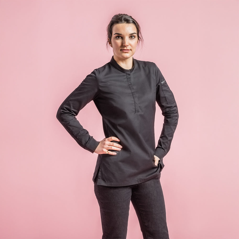 Women's chef jacket with rounded mandarin collar. 4 press buttons are hidden under the placket at the front. 2 hidden snap buttons on the wrists. Pen pocket on the left sleeve. Side slits for breathability and comfort.