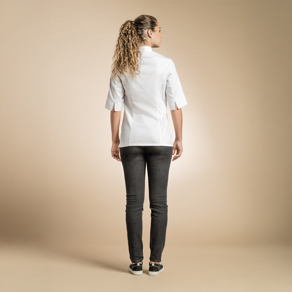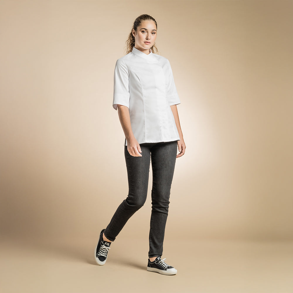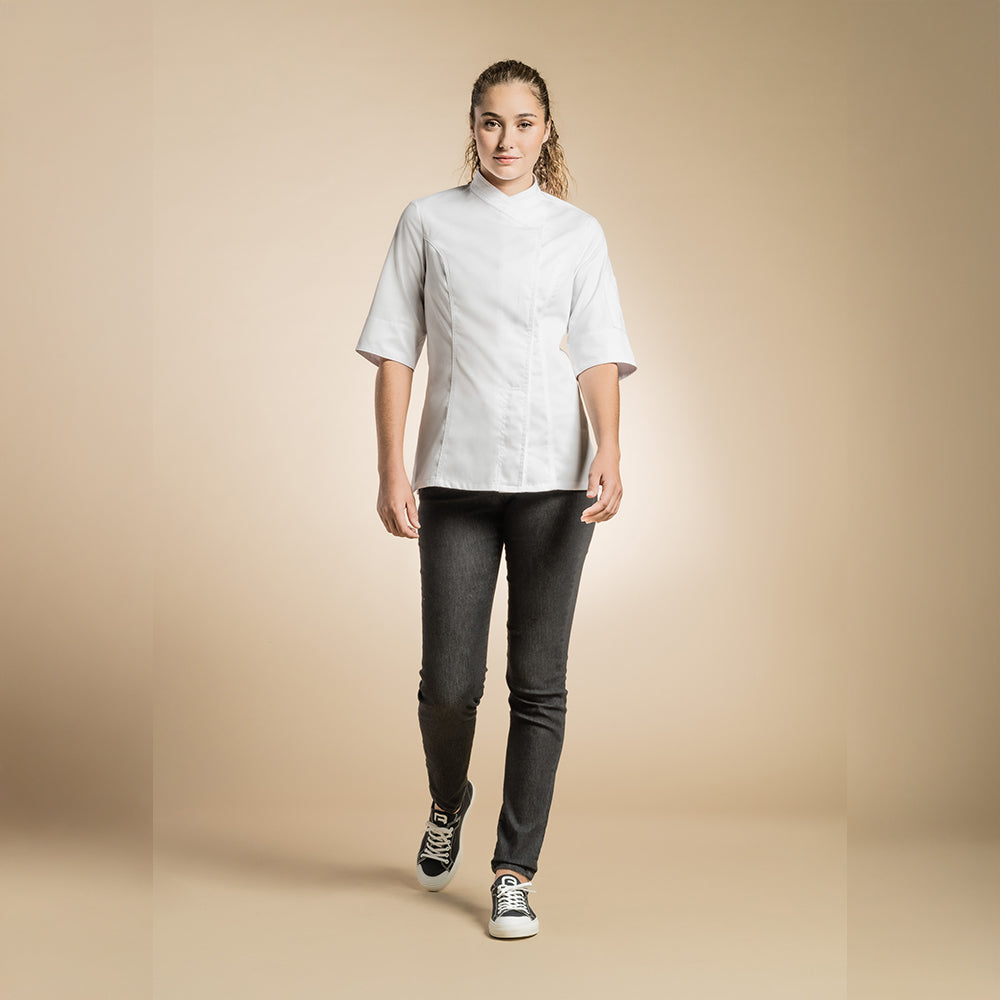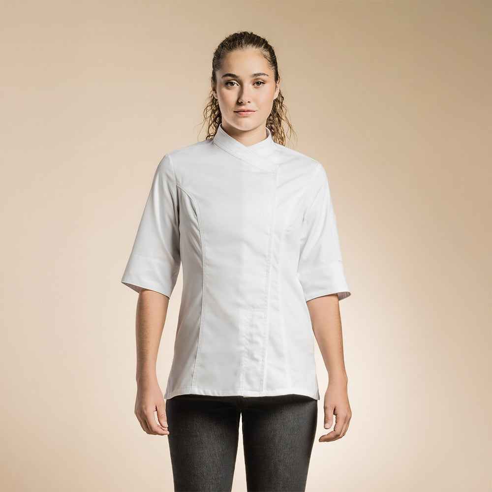 Women's French Chef Coat with kimono collar, hidden snap buttons, pen pocket on the left sleeve, side slits. Fabric 67% polyester 33% cotton. Available with long or short sleeves from T0 to T6. (see conversion chart)