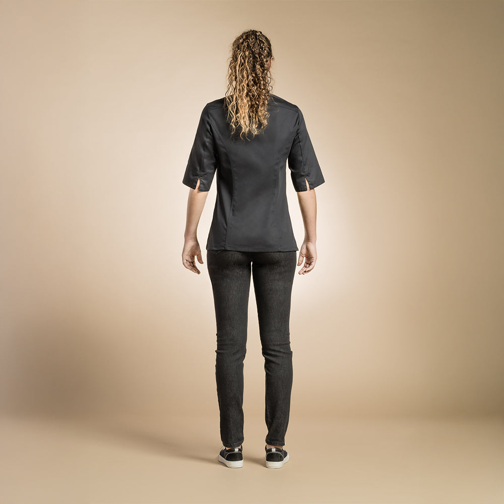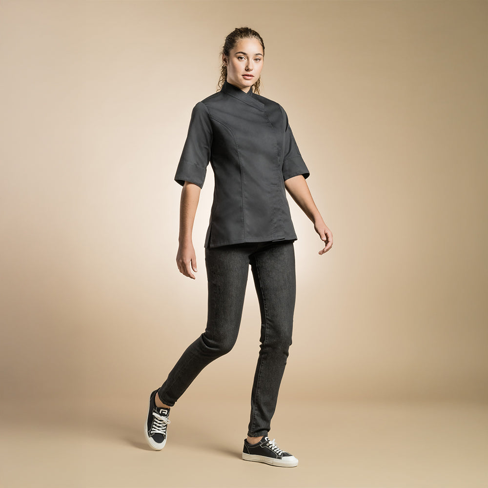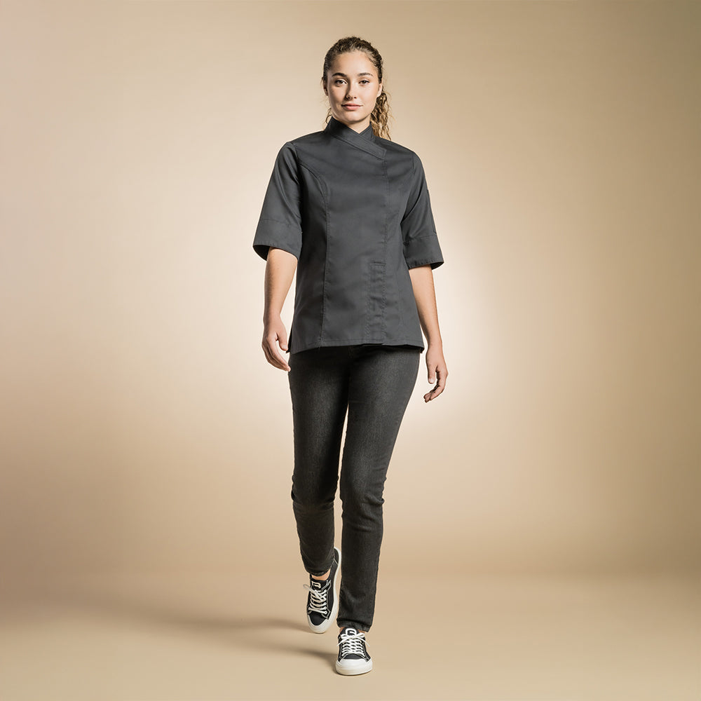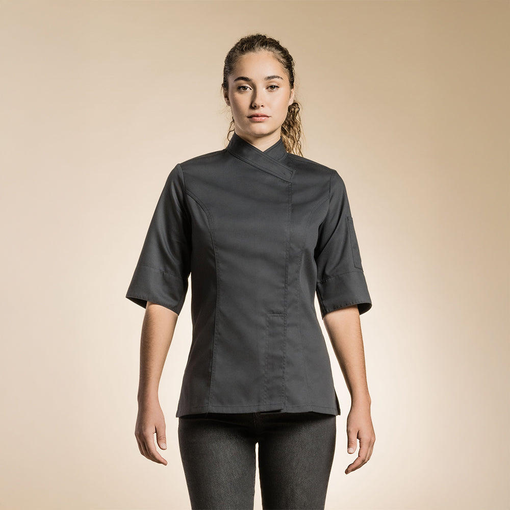 Women's French Chef Coat with kimono collar, hidden snap buttons, pen pocket on the left sleeve, side slits. Fabric 67% polyester 33% cotton. Available with long or short sleeves from T0 to T6. (see conversion chart)