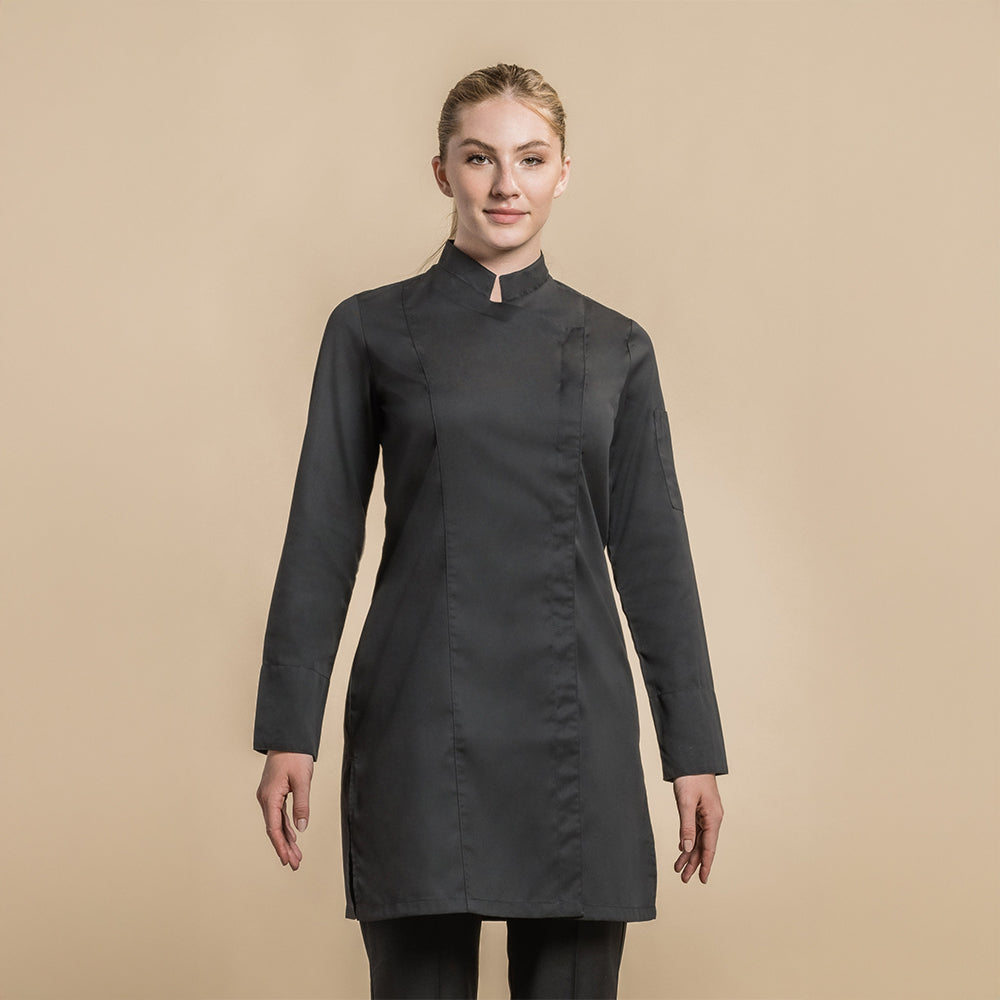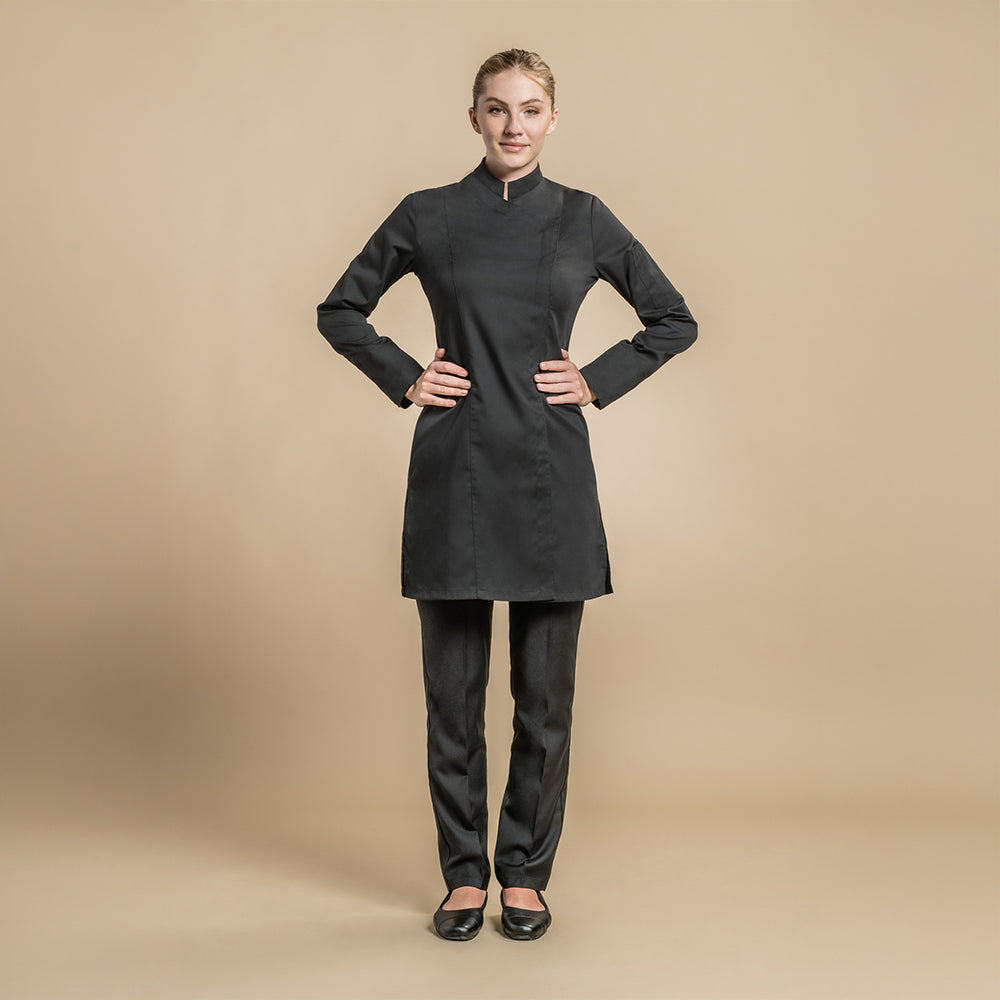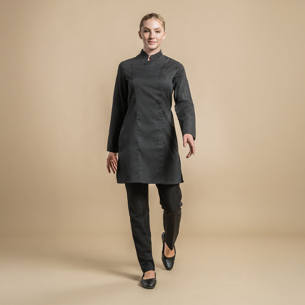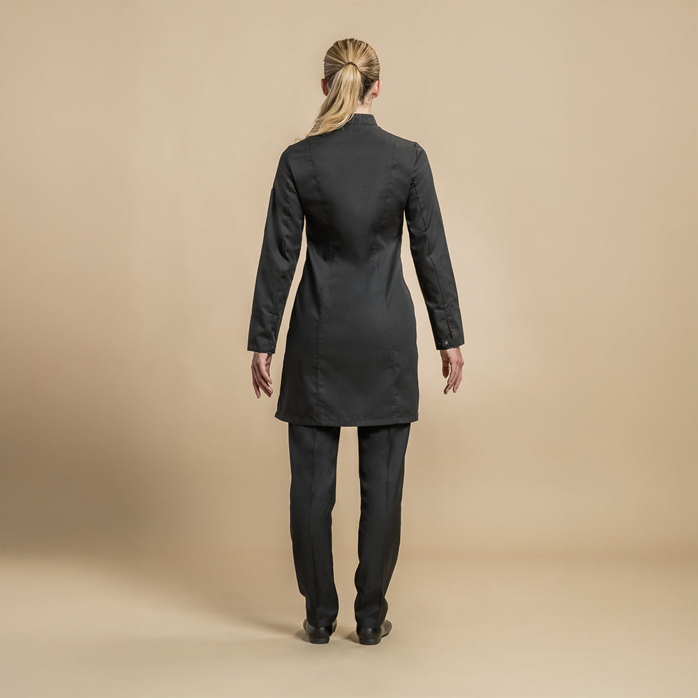 Women's service jacket with square officer collar. Hidden snap closure. Cuffs with closing tab. Pen pocket on left sleeve. Side slits. Length: 90cm for the T0. Fabric 35% cotton 65% polyester.