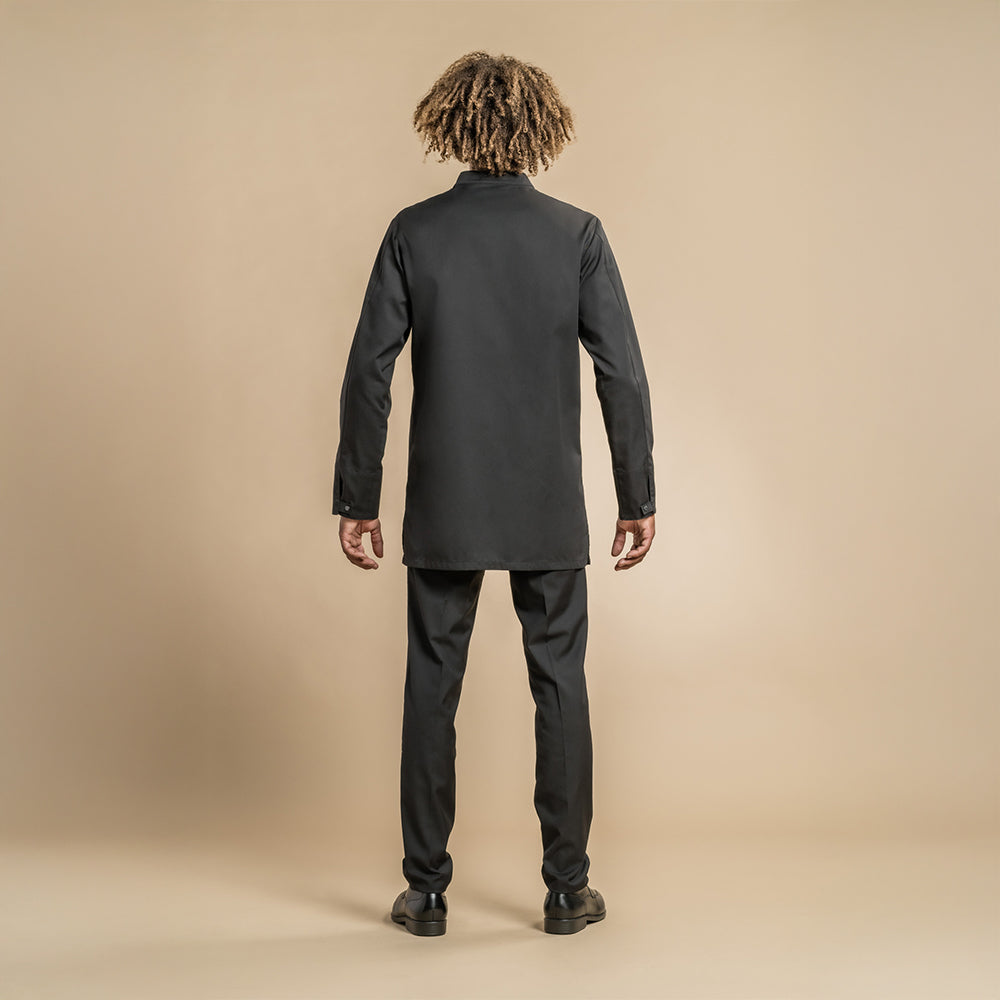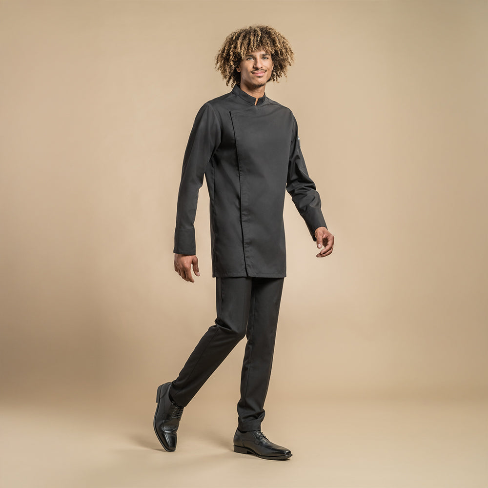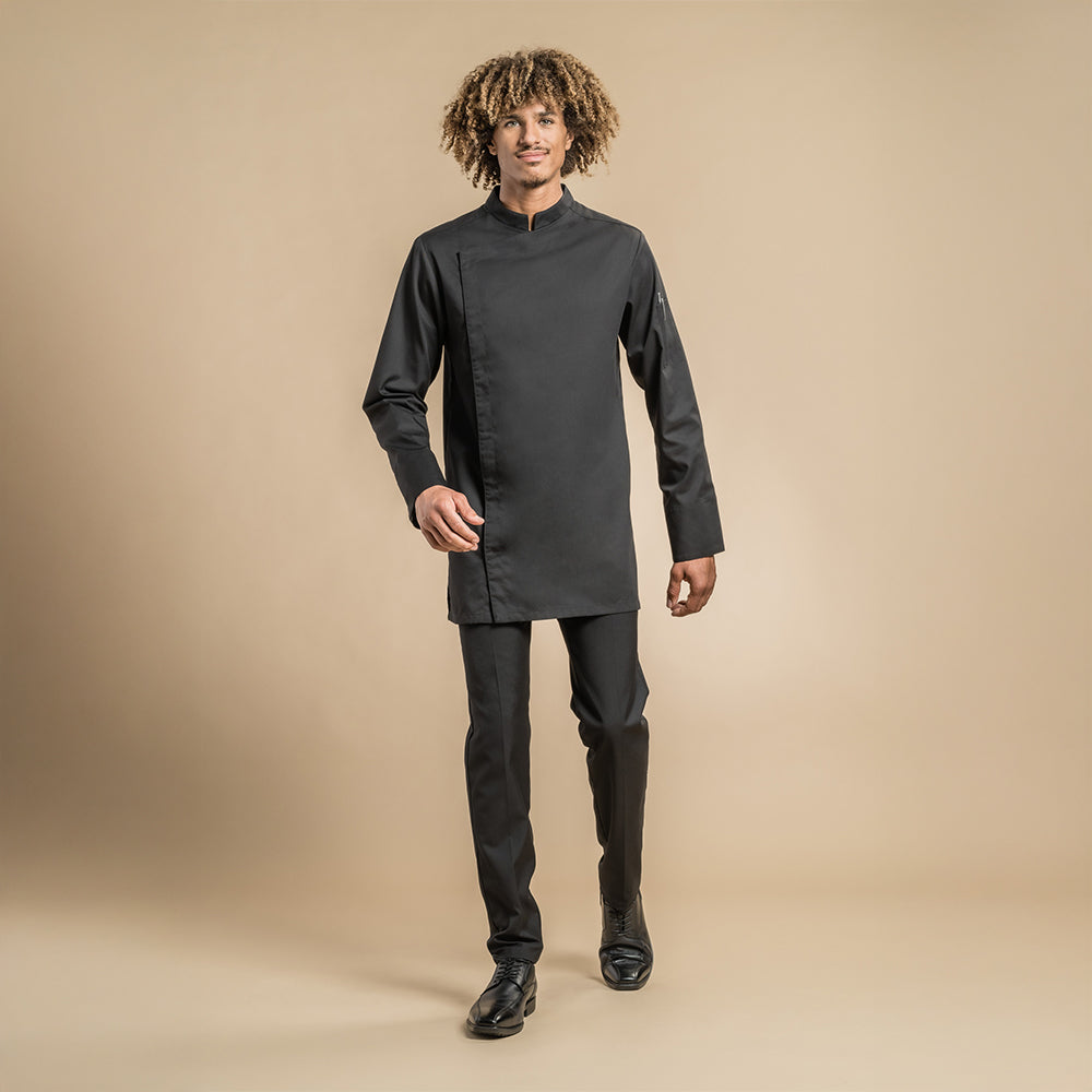 Men's service jacket with square officer collar. Hidden snap closure. Cuffs with closing tab. Pen pocket on left sleeve. Side slits.
