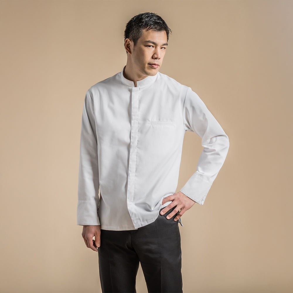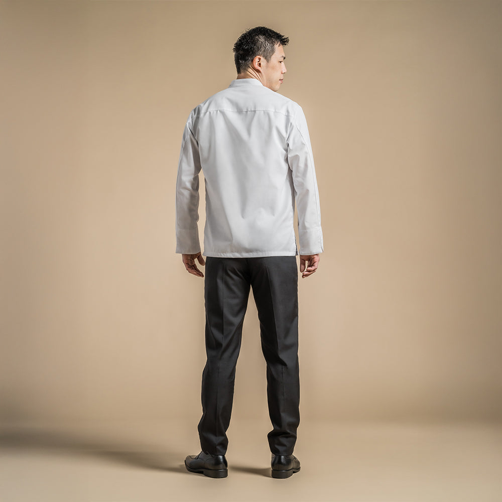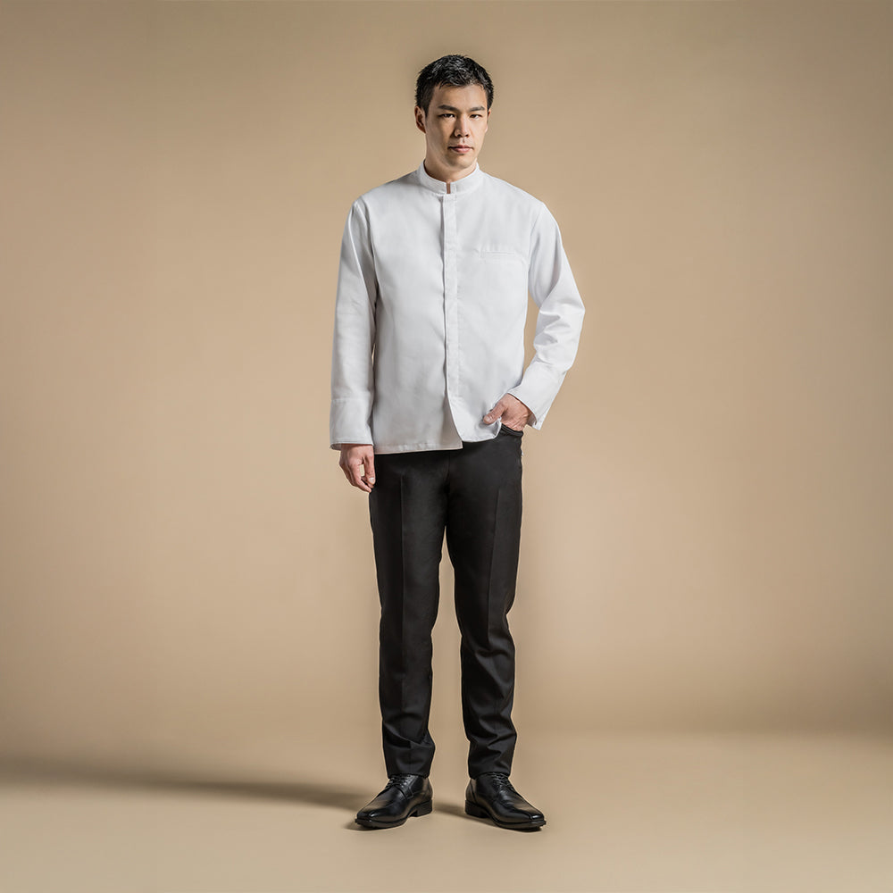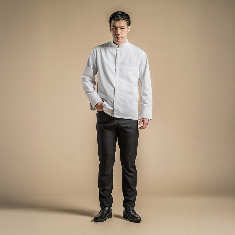 Men's chef jacket with officer collar. Central front fastening. Hidden snap buttons. Welt pocket on left of chest. Pen pocket on left sleeve. Side slits.