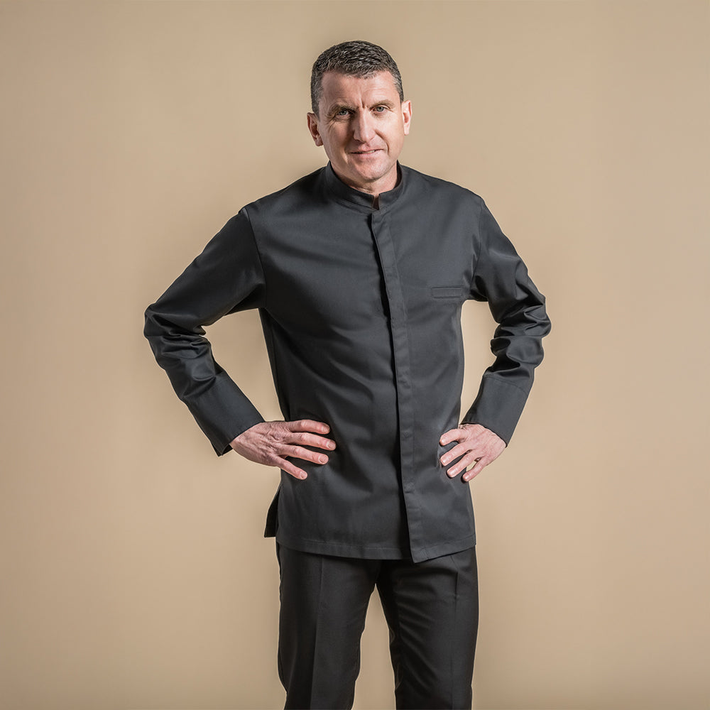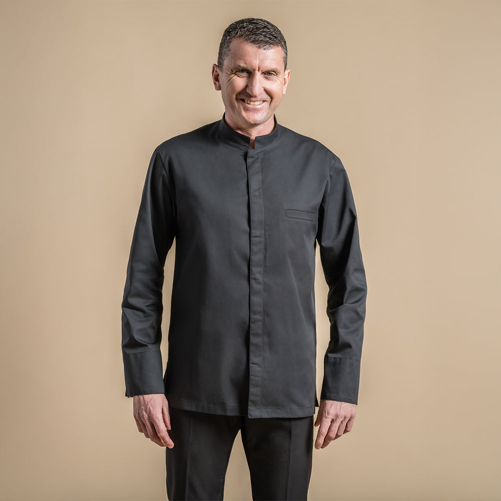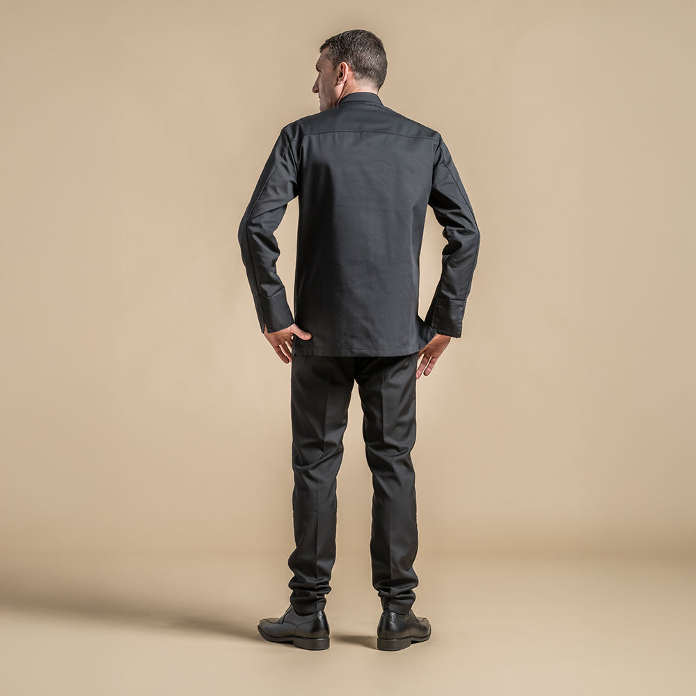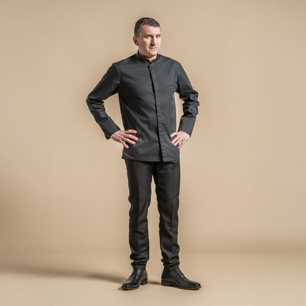 Men's chef jacket with officer collar. Central front fastening. Hidden snap buttons. Welt pocket on left of chest. Pen pocket on left sleeve. Side slits.