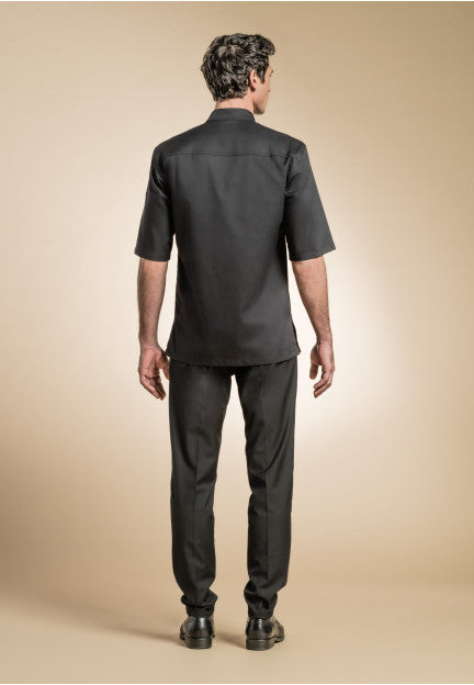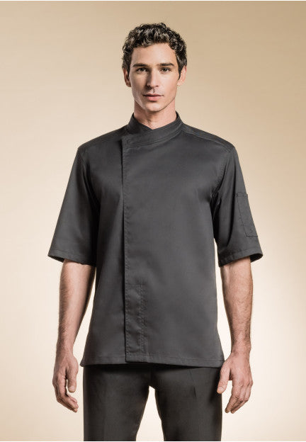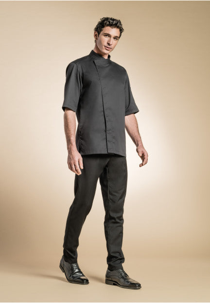 Men's Chef Coat from France: Features a double-breasted kimono collar, hidden snap buttons, a pen pocket on the left sleeve, and breathable side slits for comfortability.